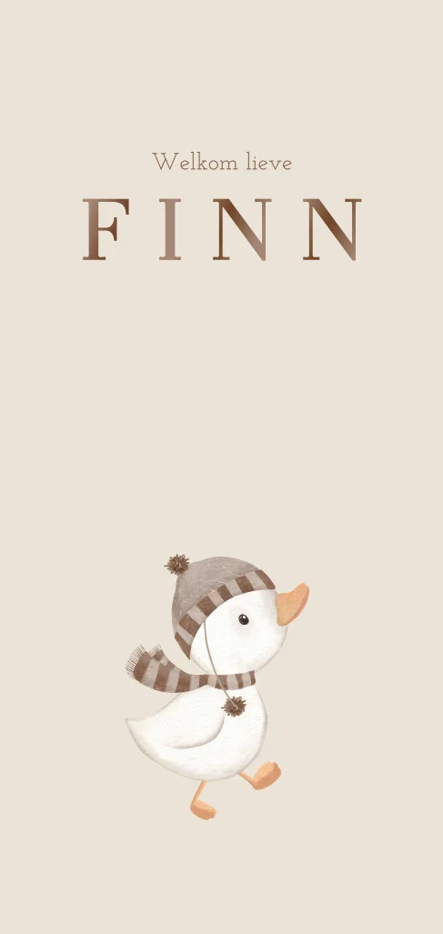 Lief geboortekaartje voor als jullie zoontje in de winter wordt geboren! Op het beige geboortekaartje staat een leuke illustratie van een wandelend eendje met sjaal en muts. De tekst is in bijpassend bruin en eenvoudig zelf aan te passen in de online editor.