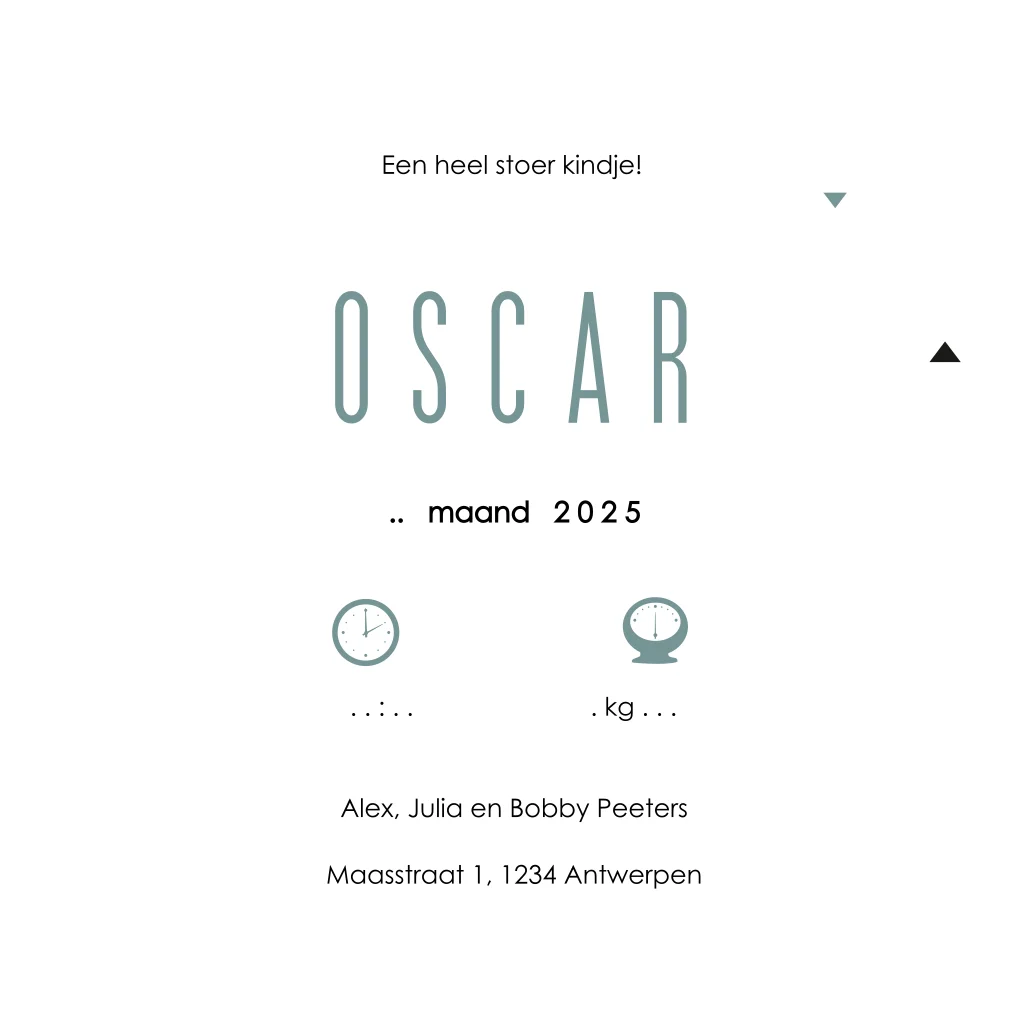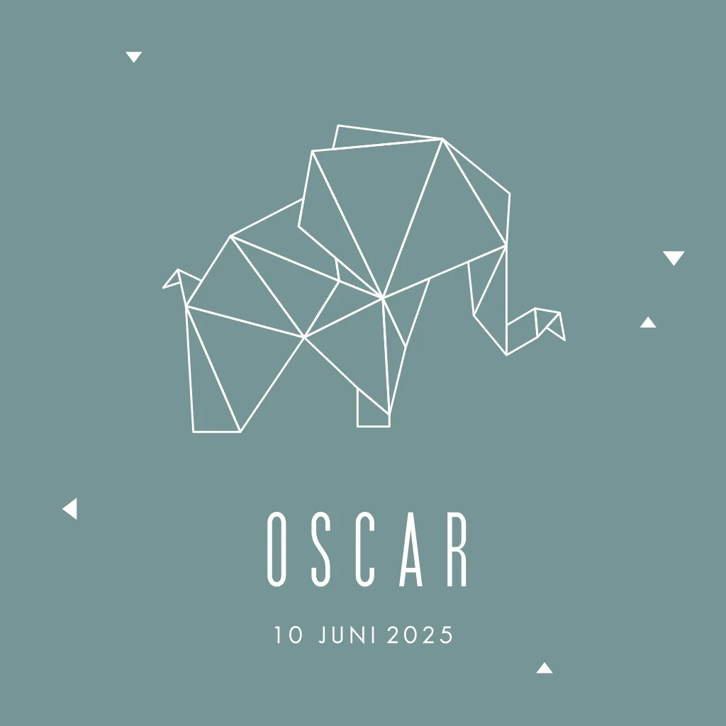 Hip babykaartje met een in lijnen getekend olifantje, geometrische vormen en witte driehoekjes op een blauwe achtergrond. Pas de tekst gemakkelijk aan in de online editor.