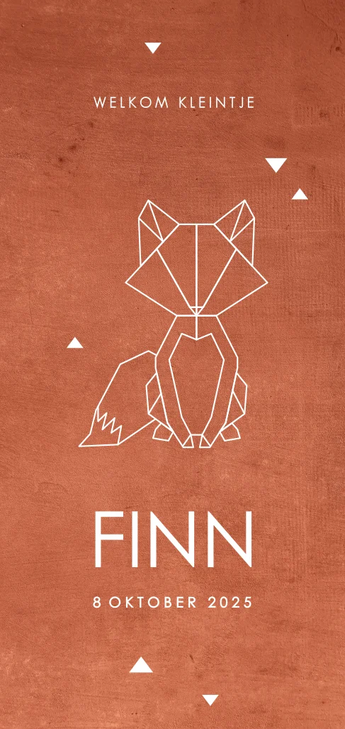 Hip babykaartje met een in lijnen getekend vosje en witte driehoekjes op een oranje, roestbruine achtergrond. Pas de tekst gemakkelijk aan in de online editor.Bekijk ook onze bijpassende uitnodiging babyborrel.