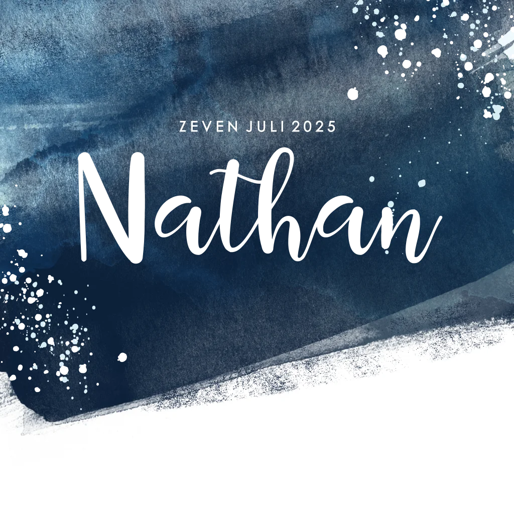 Hip, dit geboortekaartje voor een zoontje! Op een donkerblauw vlak van waterverf is de naam van de kleine in luxe goudfoliedruk, in de hoeken staan feestelijke spetters in goud en wit.