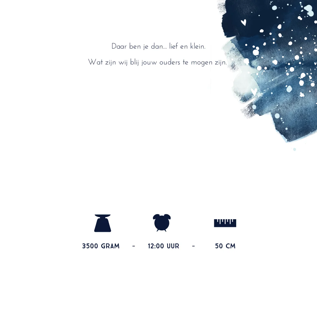 Hip, dit geboortekaartje voor een zoontje! Op een donkerblauw vlak van waterverf is de naam van de kleine in luxe goudfoliedruk, in de hoeken staan feestelijke spetters in goud en wit.| Totaalprijs: 0 |