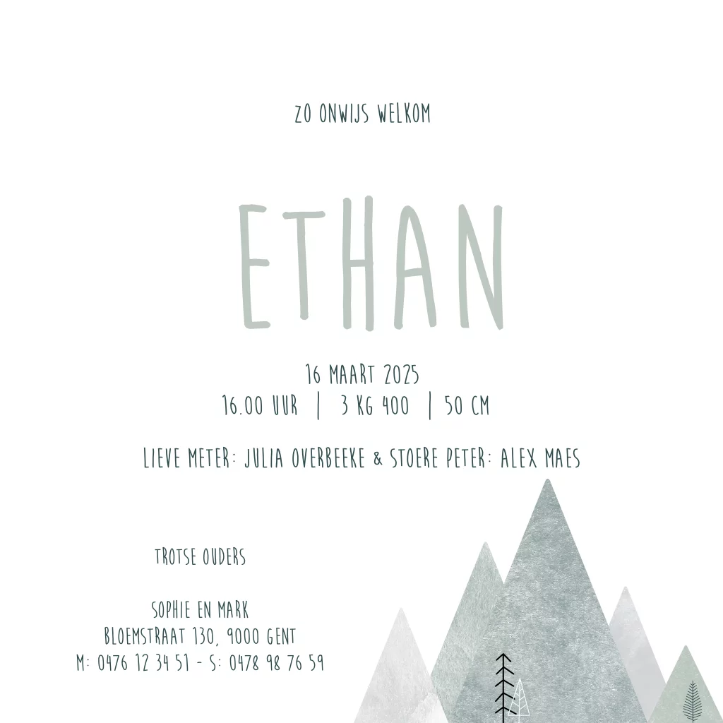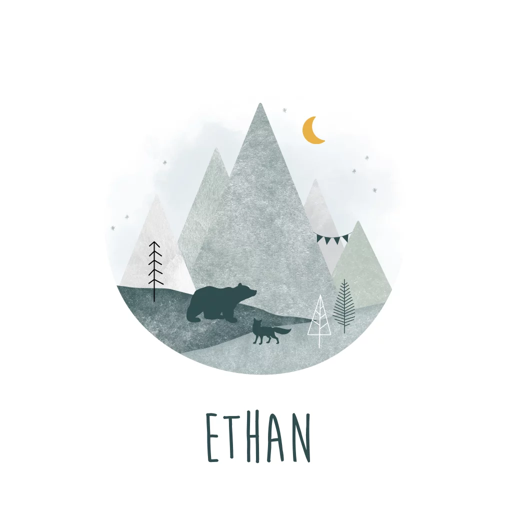 Dit trendy babykaartje is perfect voor jullie avontuurlijke kindje. In het ronde kader op de voorkant staat een landschap met bergen, een beertje, vosje, bomen en een maantje dat schijnt. De tekeningen zijn getekend in verschillende tinten blauw groen.