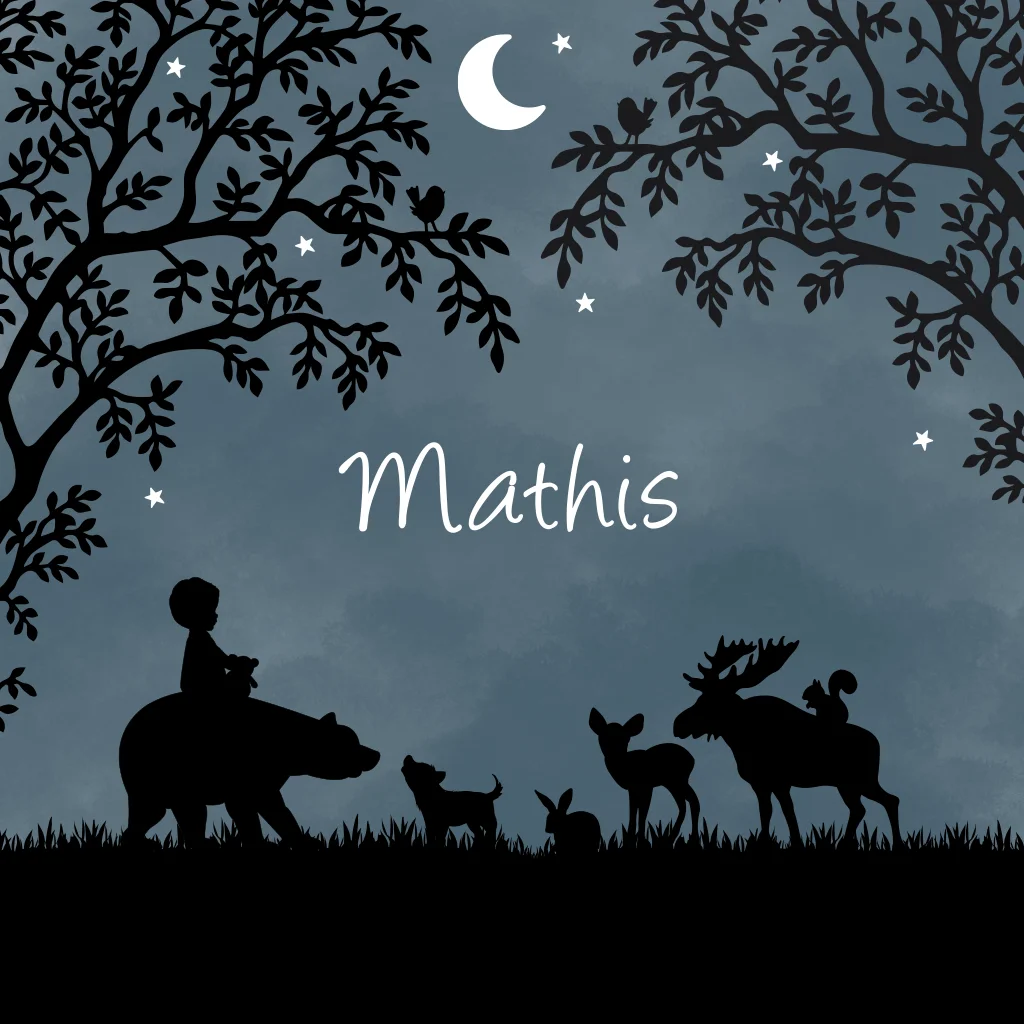 Een stoer geboortekaartje voor een jongen in donkergrijs en zwart. Onder de sterrenhemel met maan zie je de silhouetten van allerlei bosdieren, het jongetje zit op de rug van een beer. Een sfeervol tafereel op dit hippe kaartje!