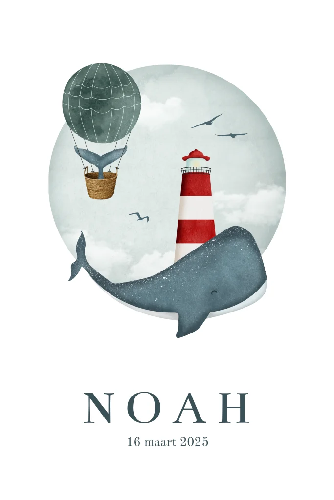 Wat een vrolijke illustratie op dit lieve babykaartje! Een walvisje, vuurtoren, luchtballon en vogels staan op een wolkenlucht als achtergrond. Pas de teksten eenvoudig aan in de online editor en maak zo super gemakkelijk een uniek geboortekaartje!
