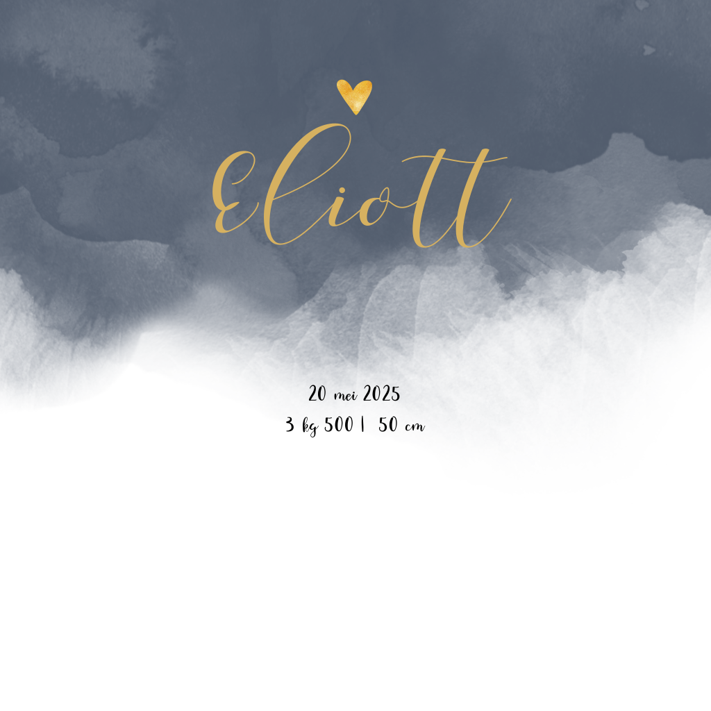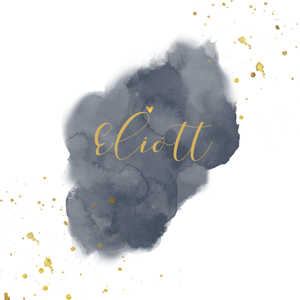 Trendy geboortekaartje met zwarte waterverf look en gouden verfspetters en hartjes. Door de witte achtergrond valt het ontwerp extra op. De naam van de newborn heeft een stijlvolle gouden typografie. Wil je liever net wat anders? Dat is zo gedaan in onze online editor. Hier pas je de kleuren, het lettertype en de tekst aan voor een geboortekaartje dat helemaal bij jouw wensen past. Je kunt ook een proefdruk bestellen om snel te zien hoe het er in het echt uitziet.Bekijk ook onze babyborrelkaartjes.