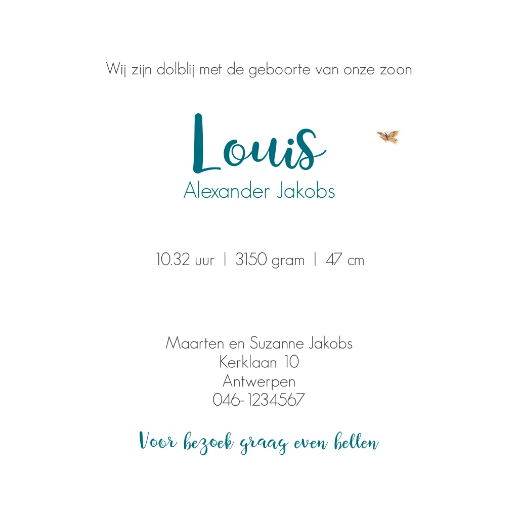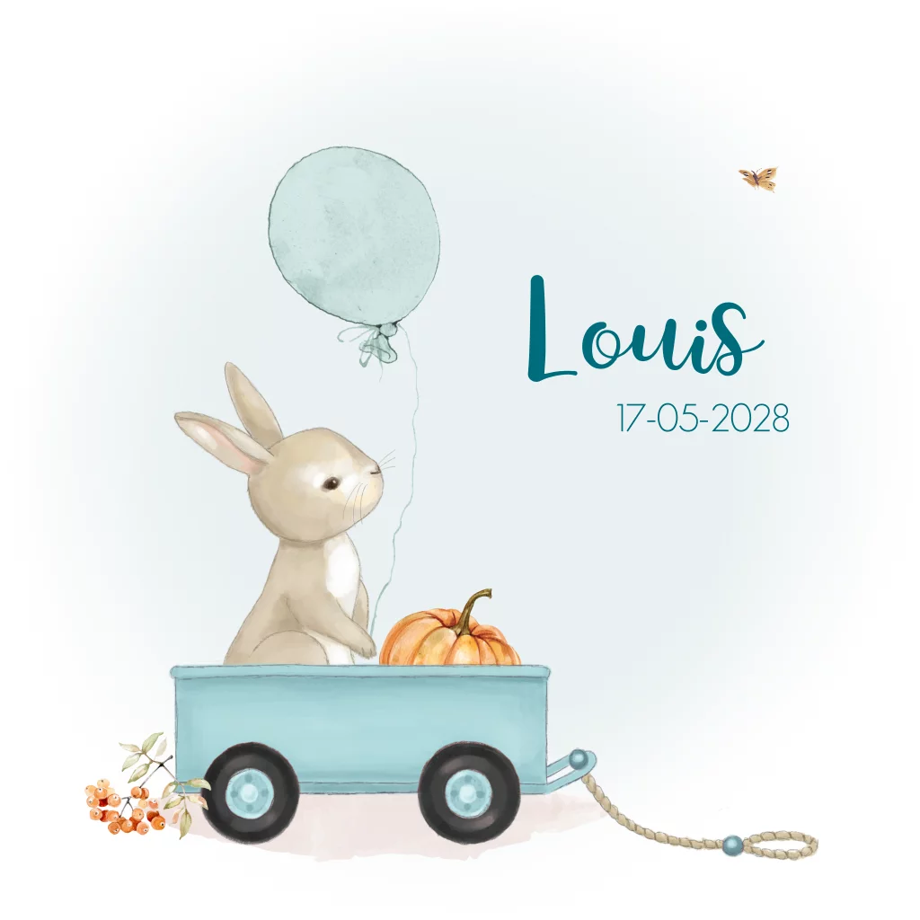 Schattig toch, dit geboortekaartje voor een jongen?! Op een lichtblauwe waterverf achtergrond zie je een lief konijntje in een bolderkar met een pompoen en een ballon erboven. Leuk kaartje als jullie zoontje in de herfst wordt geboren!