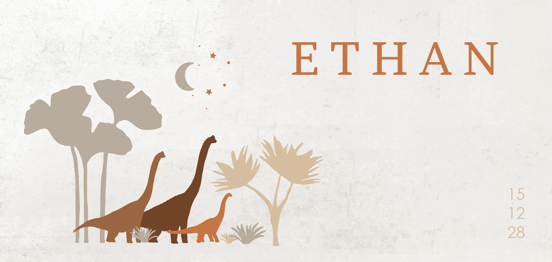 Deze beige panorama geboortekaart is speciaal voor jullie pasgeboren zoontje. Op de achtergrond zijn palmbladeren en een maan met sterren te zien.| Totaalprijs: 0 |