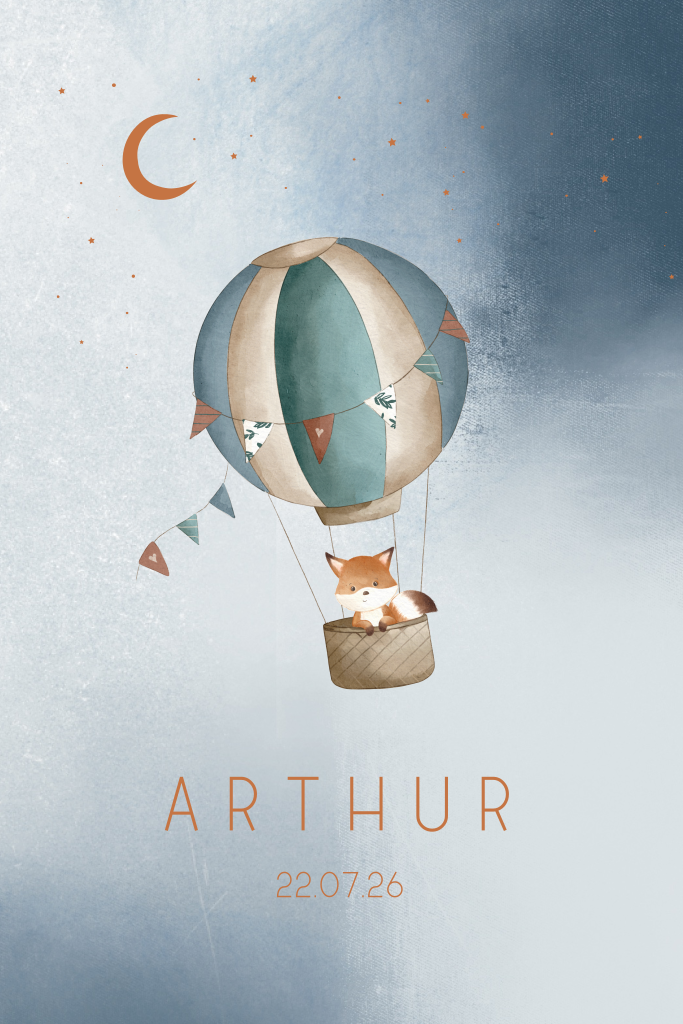 Laat met dit lieve kaartje weten dat jullie een klein jongetje hebben gekregen. Op de kaart vliegt een vosje in een feestelijke luchtballon door de nacht. De maan en sterren en de naam van jullie kindje maken deze geboortekaart nog specialer.