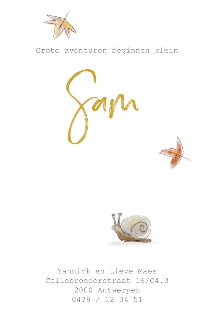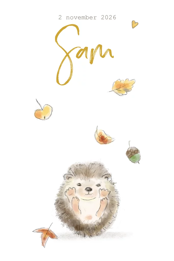 Is jullie kindje in de herfst geboren? Dan is dit mooie geschilderde geboortekaartje met tekeningen van een egeltje, slak en herfstbladeren perfect. De tekeningetjes zijn ingekleurd met waterverf.
