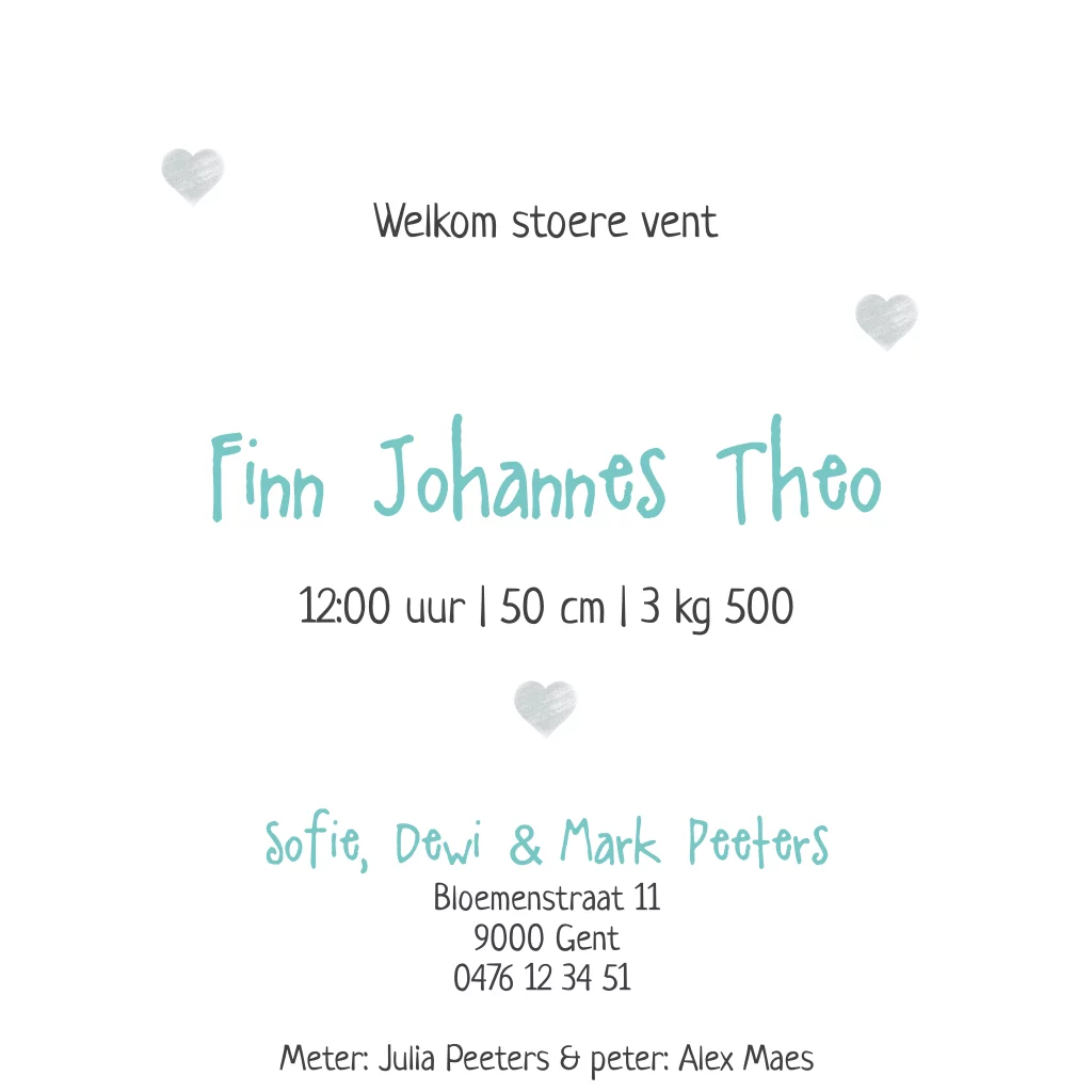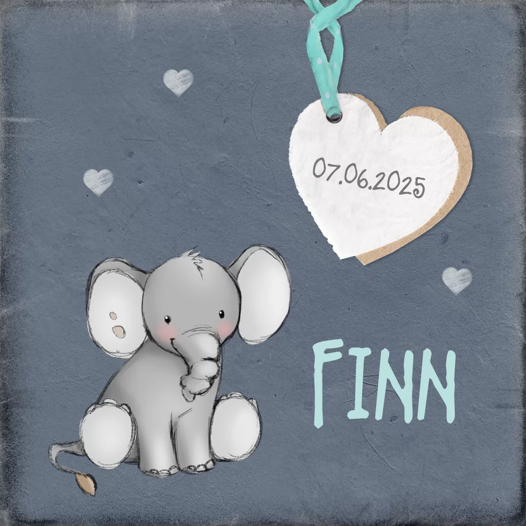 Ben je op zoek naar een dierenkaart? Deze kaart met de illustratie van een olifant is perfect. Op een jeansblauwe achtergrond staat een grappig, zittend olifantje met kleine hartjes erboven. In het hartje kan de datum aangegeven worden. Pas het kaartje zelf aan in de online editor, zo gedaan!