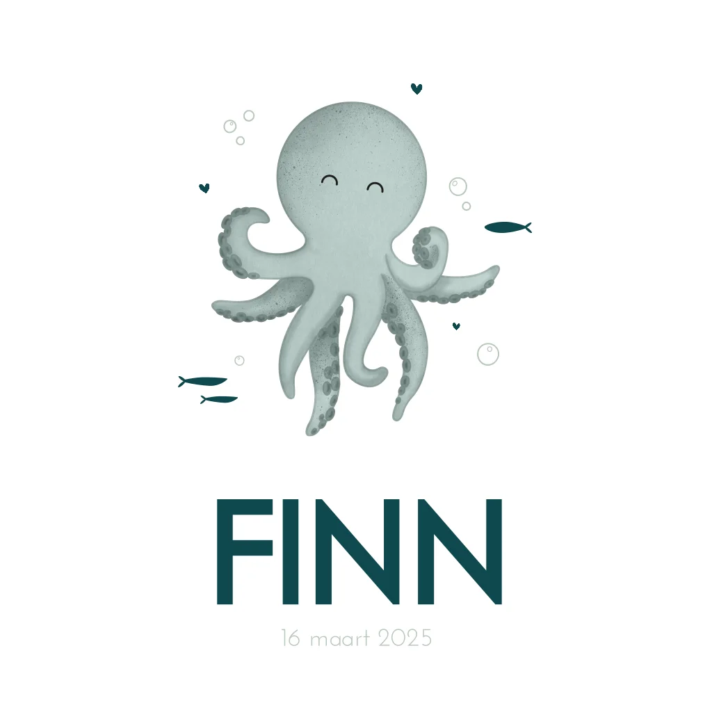 Wat een lieve octopus op dit hippe babykaartje met afgeronde hoeken! De kleine visjes en waterbubbels maken de onderwaterwereld op dit kaartje helemaal af. Pas de teksten en kleuren gemakkelijk aan in de online editor.
