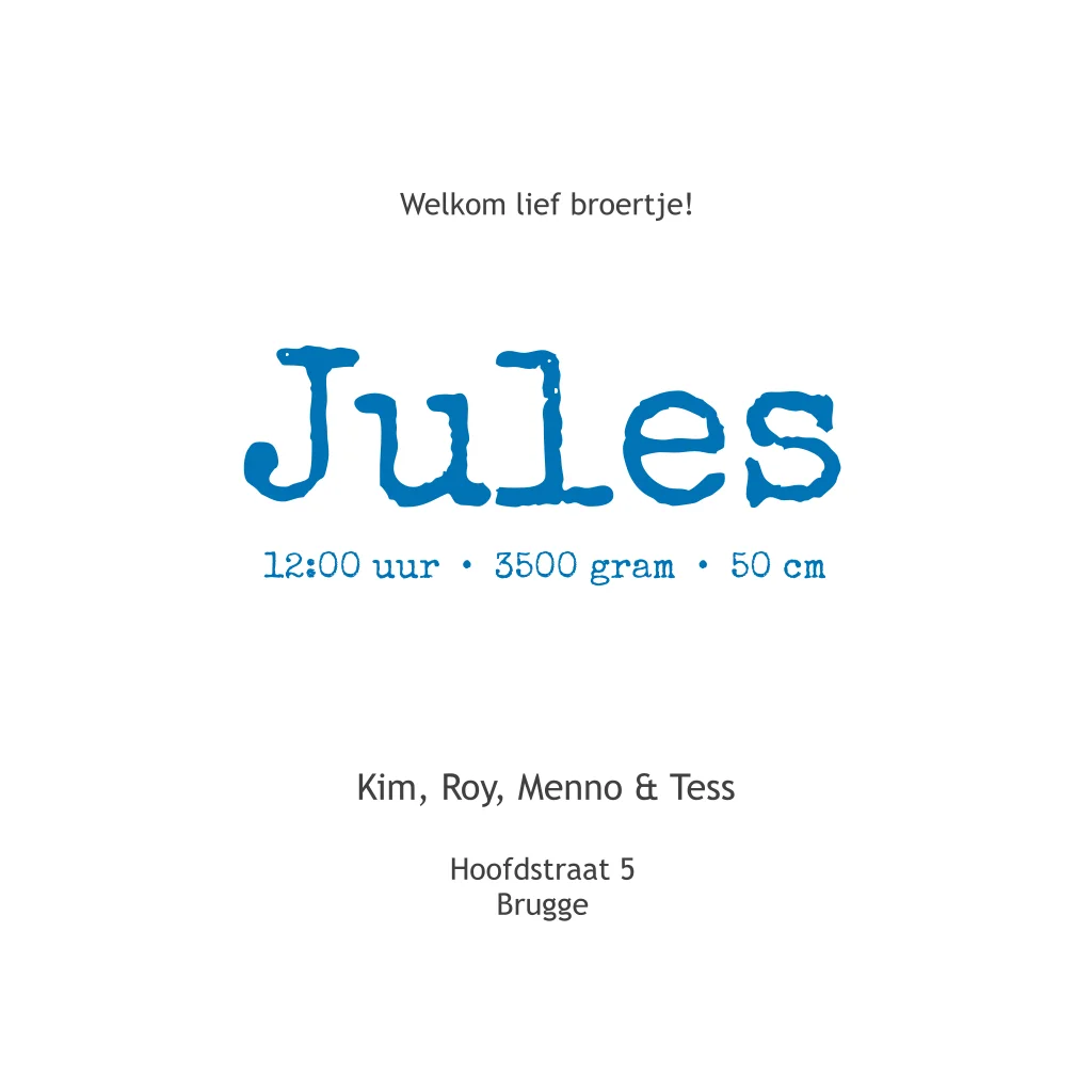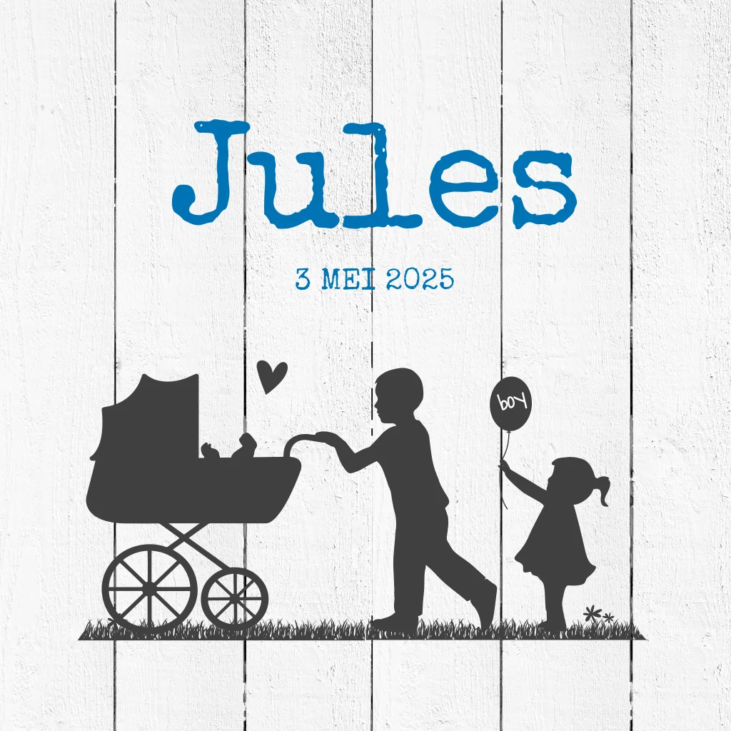 Gaat jullie gezin zich uitbreiden? De silhouetten van een zusje en een jongetje die de kinderwagen duwen zijn prachtig. Door de houten achtergrond heeft deze kaart iets stoers. Pas de tekst gemakkelijk zelf aan in de editor en jullie kaartje is klaar voor verzending.