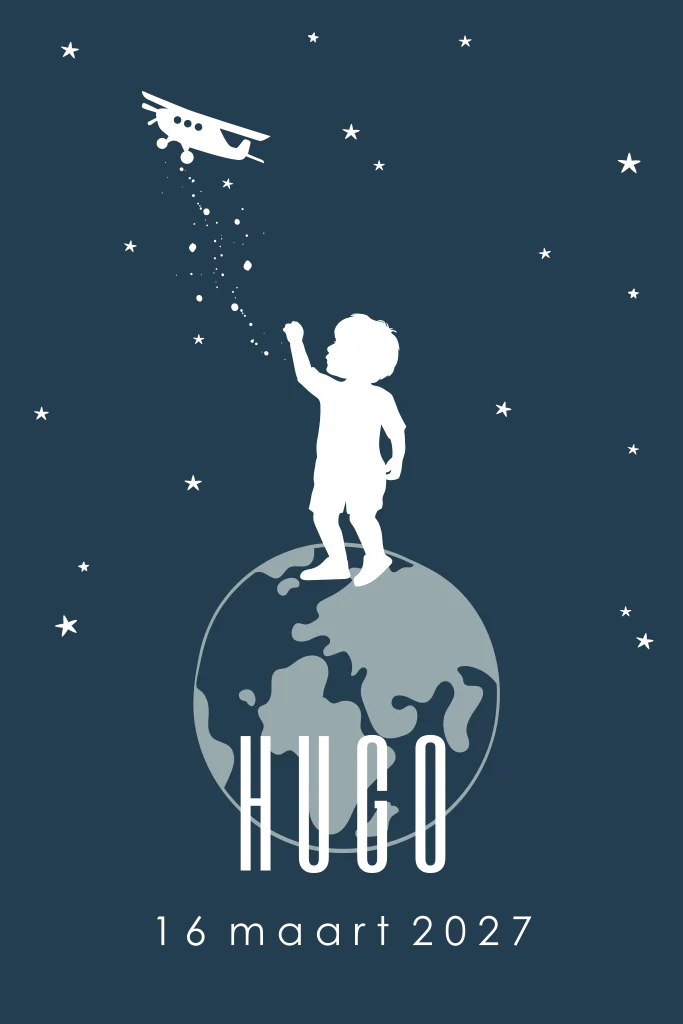 Een stoer geboortekaartje voor een jongen in donkerblauw gecombineerd met goudfolie. Op de wereldbol zie je het silhouet van een jongetje dat naar een vliegtuig in de sterrenhemel kijkt.