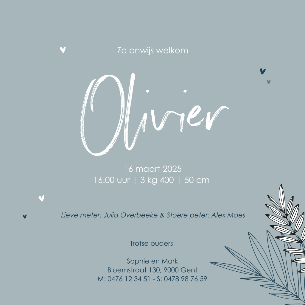 Op zoek naar een babykaartje om de geboorte van je stoere zoon aan te kondigen? Dan is dit kaartje met een dino, takjes en bladeren echt wat voor jou! Het kaartje is vormgegeven in verschillende tinten grijs. Pas de teksten en eventueel kleuren naar wens aan in de online editor.