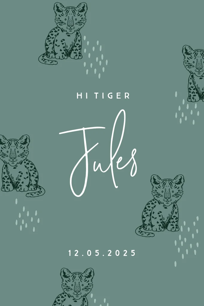 Op zoek naar een stoer geboortekaartje voor de geboorte van je zoontje? Op dit hippe kaartje staat een patroon van tijgerwelpjes en lichte tijgervlekjes op een groene achtergrond. Pas de teksten en kleuren op dit kaartje aan in de online editor en maak zo eenvoudig een uniek geboortekaartje.