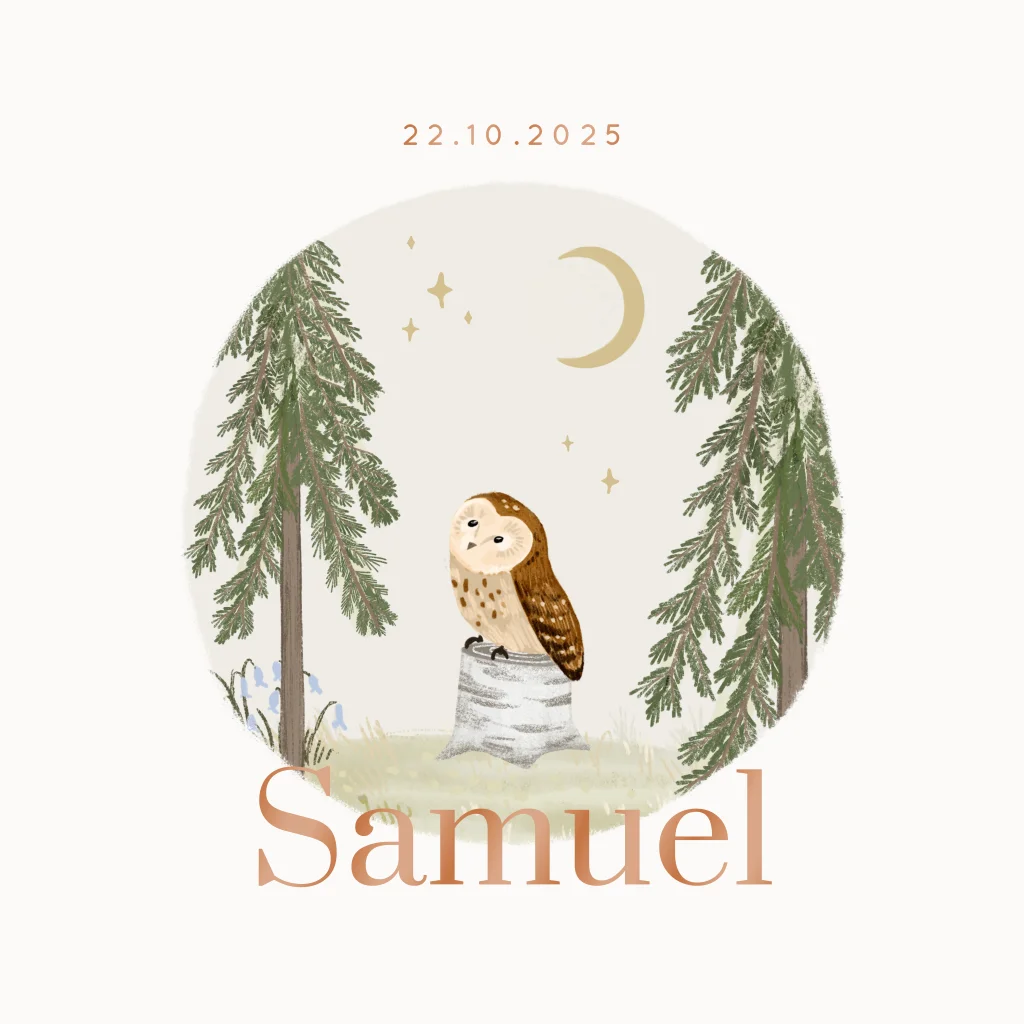Geboortekaartje jongen met illustratie van uiltje, bos en hoogglans