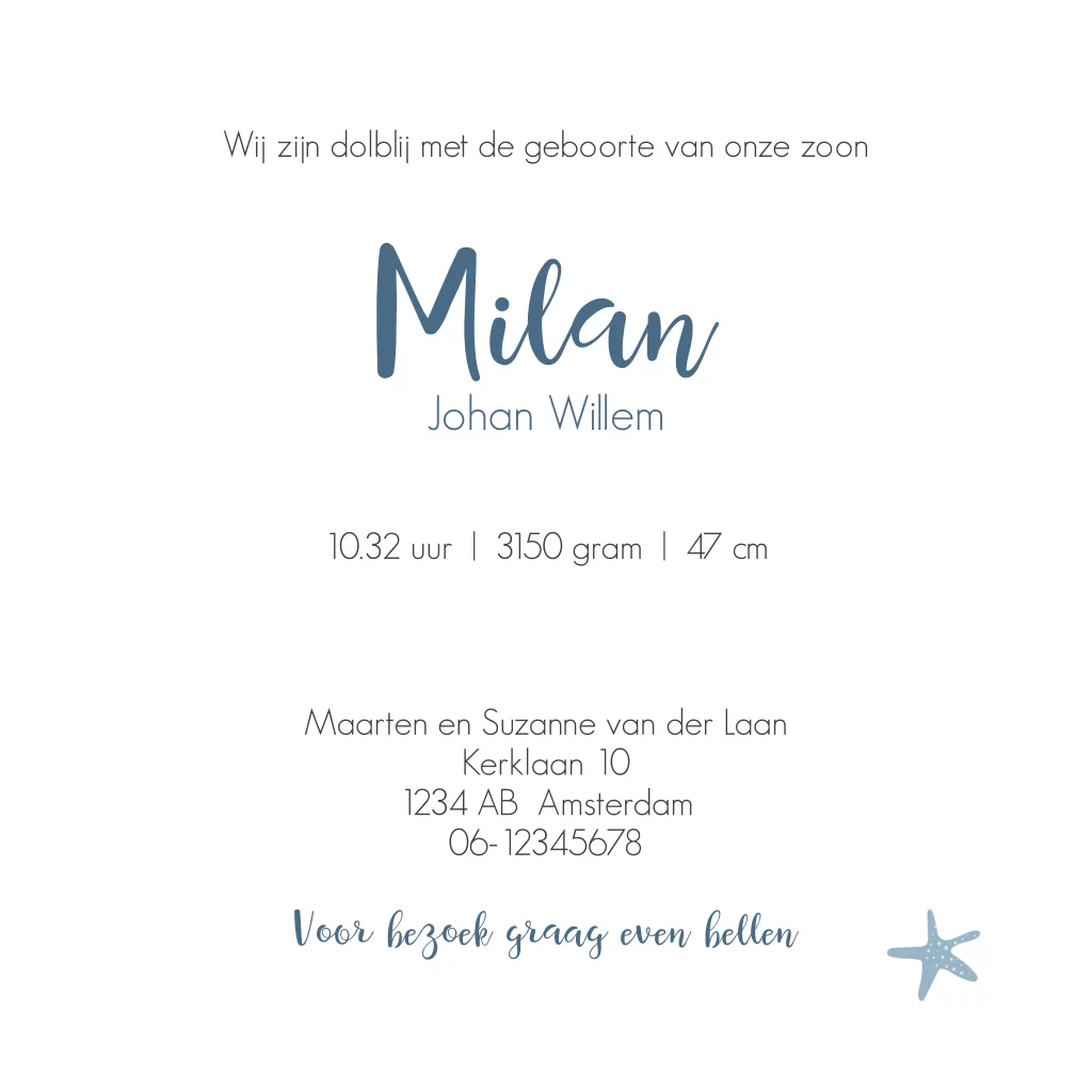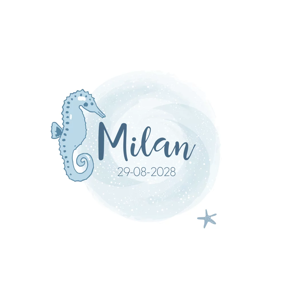 Lief, dit geboortekaartje voor een jongen! Op het witte kaartje staat een lichtblauw waterverf vlak met een blauw zeepaardje naast de naam. Aan de binnenkant komt het zee-thema weer terug, pas de teksten aan in de online editor en bestel een proefdruk.