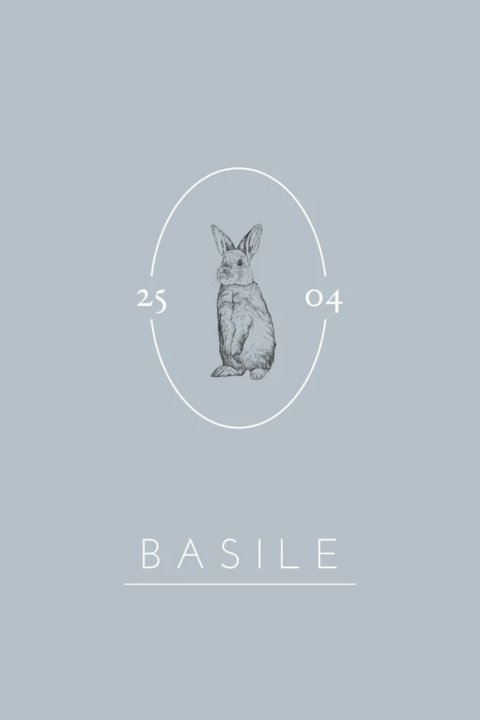 Lief geboortekaartje met een getekend konijntje in een ovaal met de geboortedatum. De achtergrond is grijsblauw.