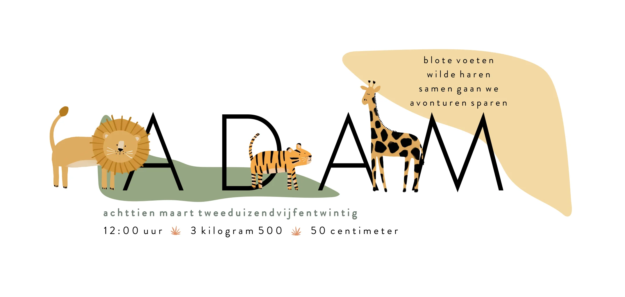 Stoer geboortekaartje met verschillende jungledieren, zoals een leeuw, tijger en een giraffe die langs de grote letters van de naam staan. Op de achtergrond gekleurde vlakken in groen en zand. Personaliseer het kaartje volledig naar eigen wens in de editor.