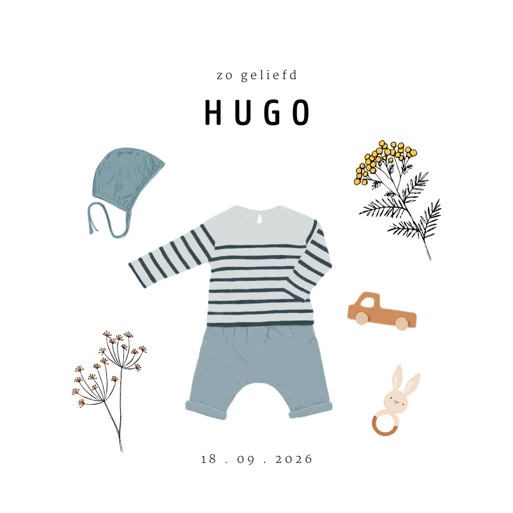 Geboortekaartje met kleding, bloemen en babyspeelgoed