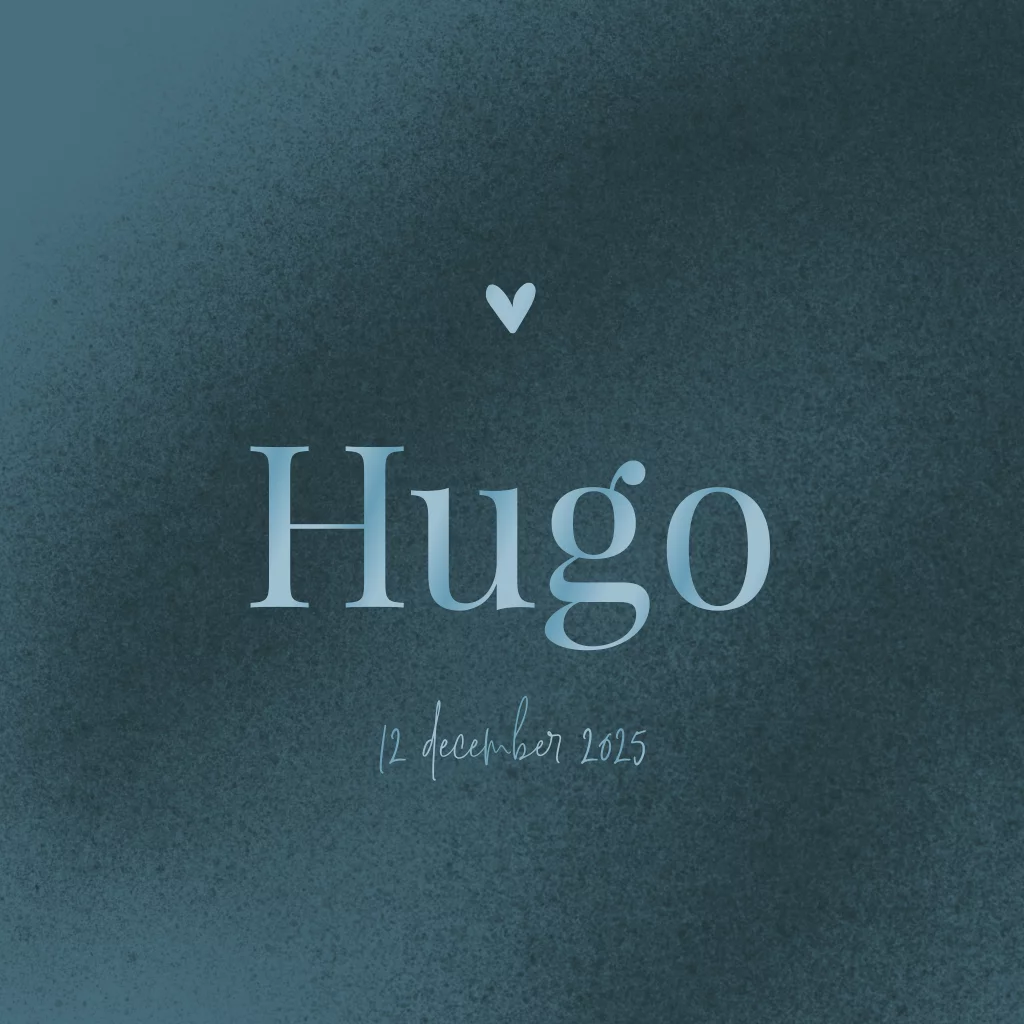 Eenvoudig geboortekaartje met een blauwgroene achtergrond, hierdoor komen de naam en het hartje van hoogglans mooi naar voren. Aan de binnenzijde is ruimte om een foto van de kleine te uploaden, pas zelf het kaartje naar wens aan in de online editor, zo gedaan!