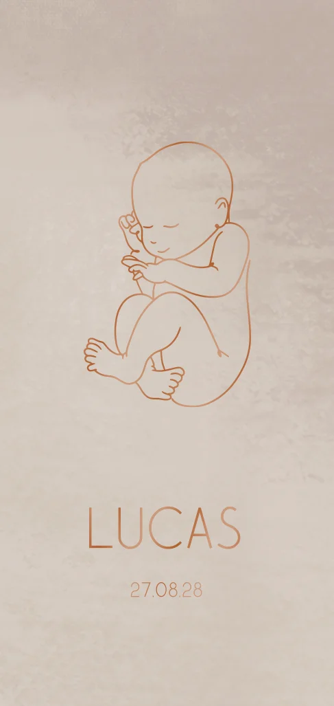 Dit stijlvolle unisex geboortjekaartje is speciaal voor voor jullie pasgeboren kindje. Op de beige achtergrond glanst een lijntekening van een slapende baby in hoogglans. Daaronder kunnen jullie de naam van jullie kleintje toevoegen in onze online editor.