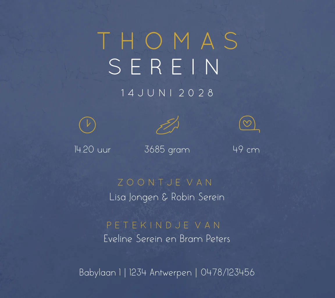 Op dit stijlvolle geboortekaartje staat een lijntekening van een lief gezinnetje. De donkerblauwe achtergrond zorgt ervoor dat de lijntekening en de naam van jullie kleintje mooi naar voren komen.
