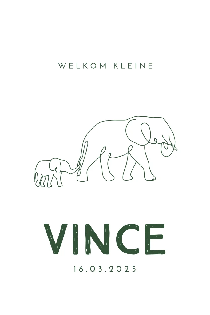 Stoere geboortekaart met een donkergroene lijntekening van een moeder- en baby-olifant. Je kunt de teksten en de lijntekening ook in een andere kleur zetten in de online editor, zodat het echt jouw stijl wordt.