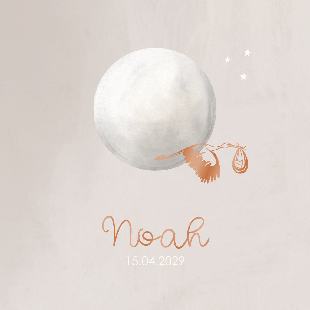 Lief geboortekaartje in wit en beigetinten. Op de kaart staat een maan en een ooievaar met baby. Laat de naam van jullie kindje schitteren in glansfolie.