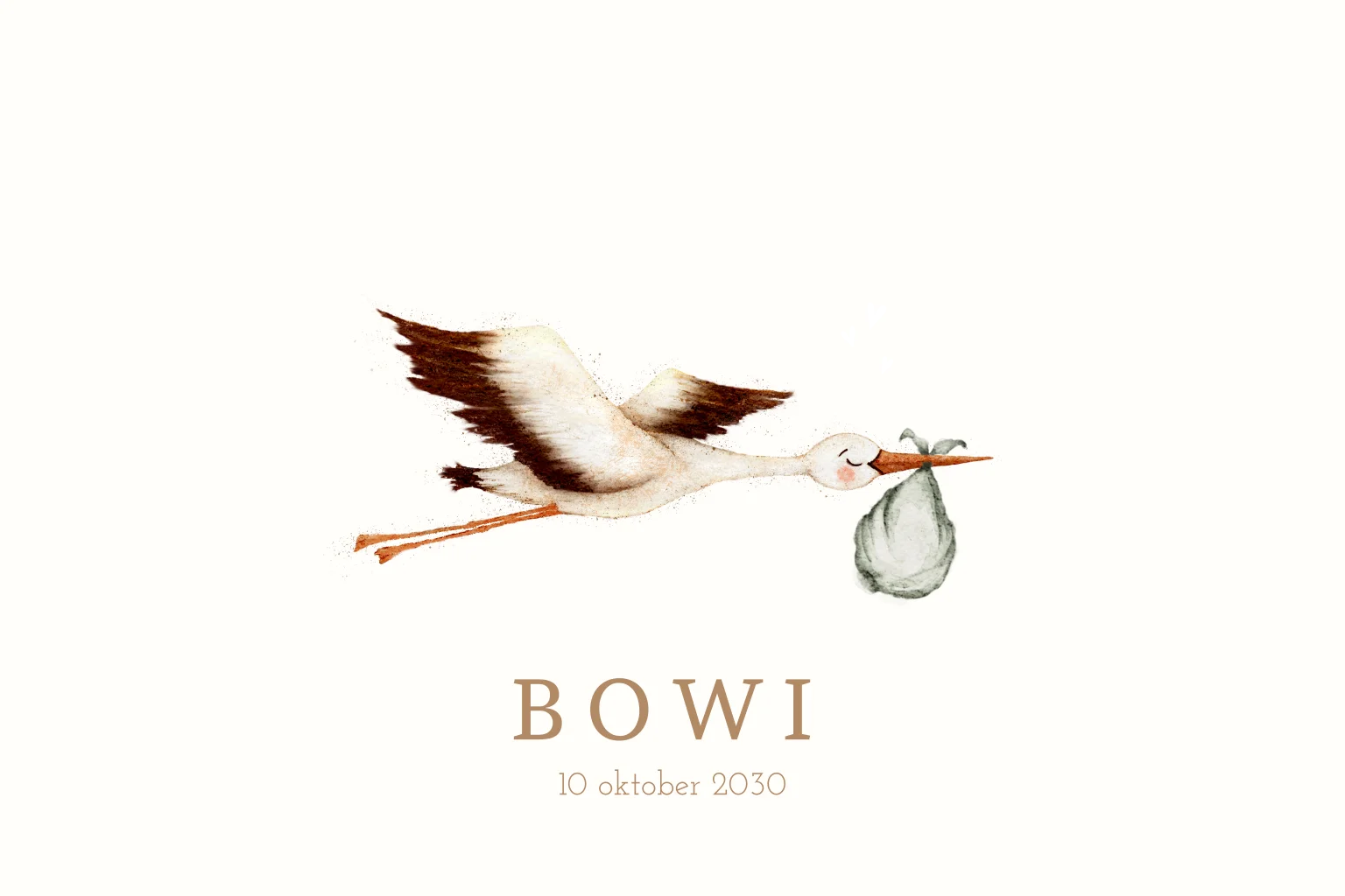 In de binnenzijde staat een ooievaar met zijn pakketje klaar om af te leveren. Het kaartje is volledig aan te passen in de online editor.