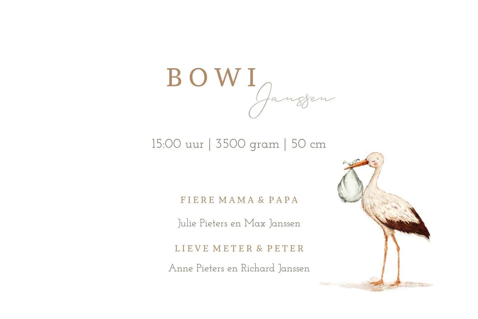 Dit geboortekaartje voor een jongen of meisje in neutrale kleur. Op de achtergrond vliegt een getekende aquacolour ooievaar.