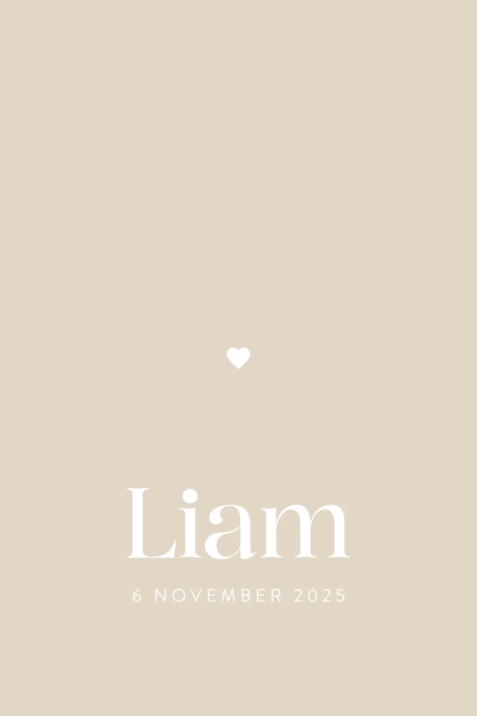 Een eenvoudig geboortekaartje met een neutrale achtergrond. De goudfolie details maken het geboortekaartje luxe en geven het een prachtige uitstraling. Boven de naam van jullie kleintje staat een klein hartje in goudfolie.