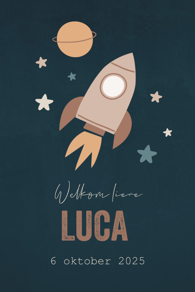 Een stoer geboortekaartje voor de geboorte van jullie zoontje of dochtertje. Het kaartje heeft een donkerblauwe achtergrond met daarop verschillende sterren, een planeet en raket.