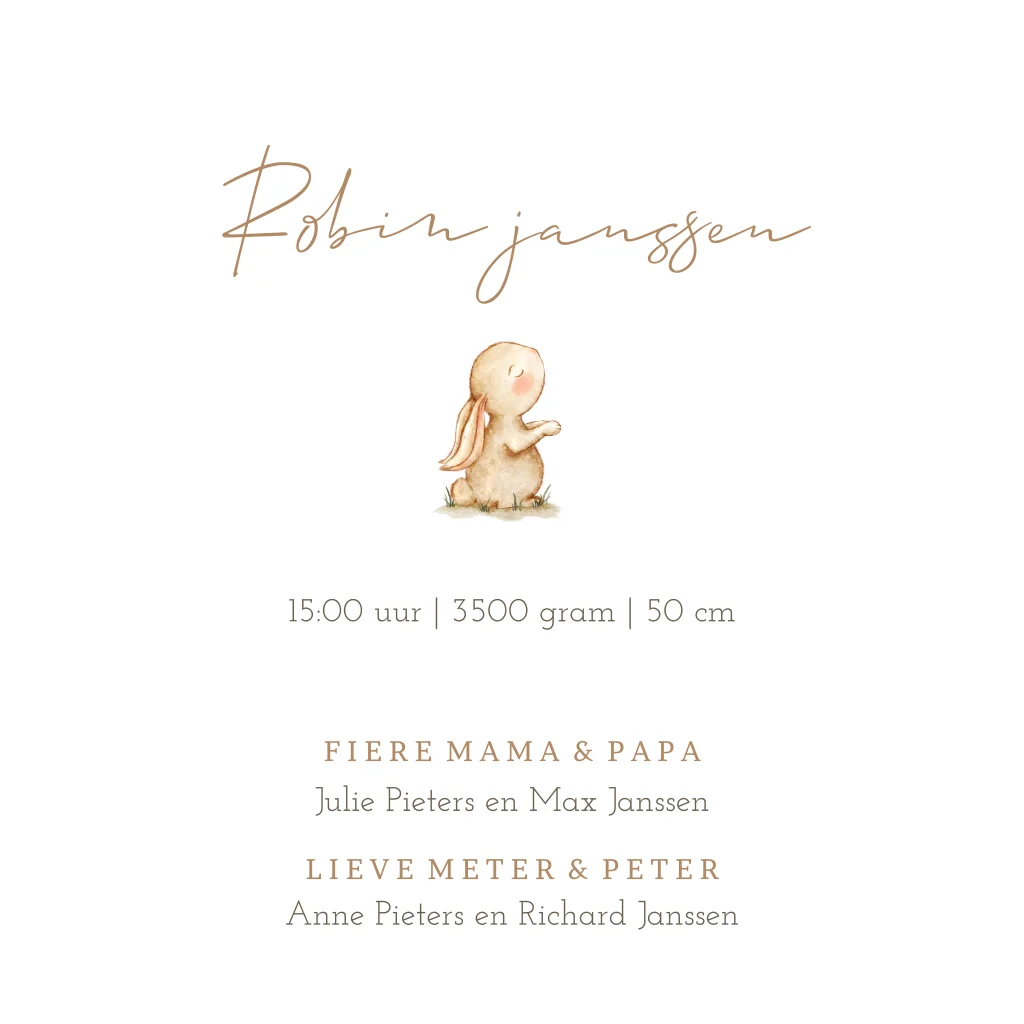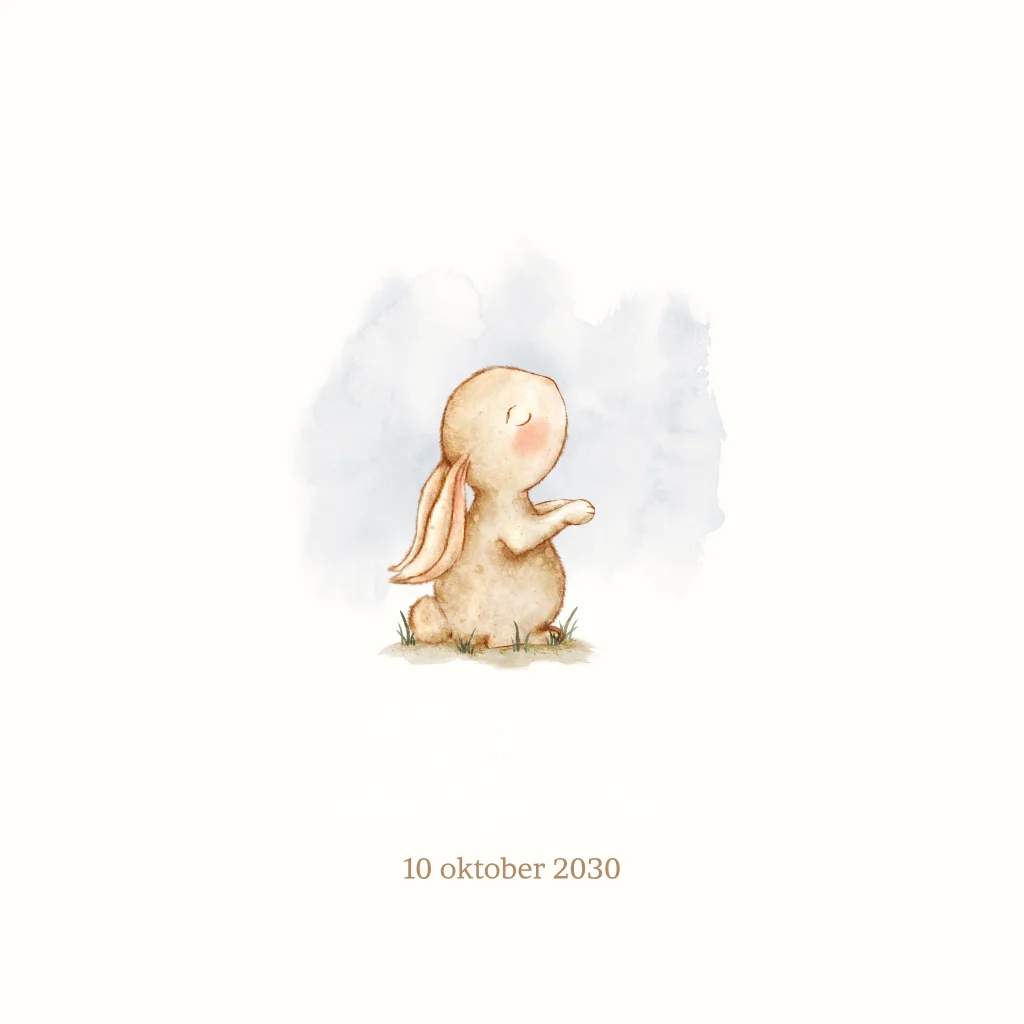 Schattig geboortekaartje met een lief konijntje en letters in goudfolie. Het geboortekaartje kun je zelf verder helemaal aanpassen naar je eigen wensen in onze editor.