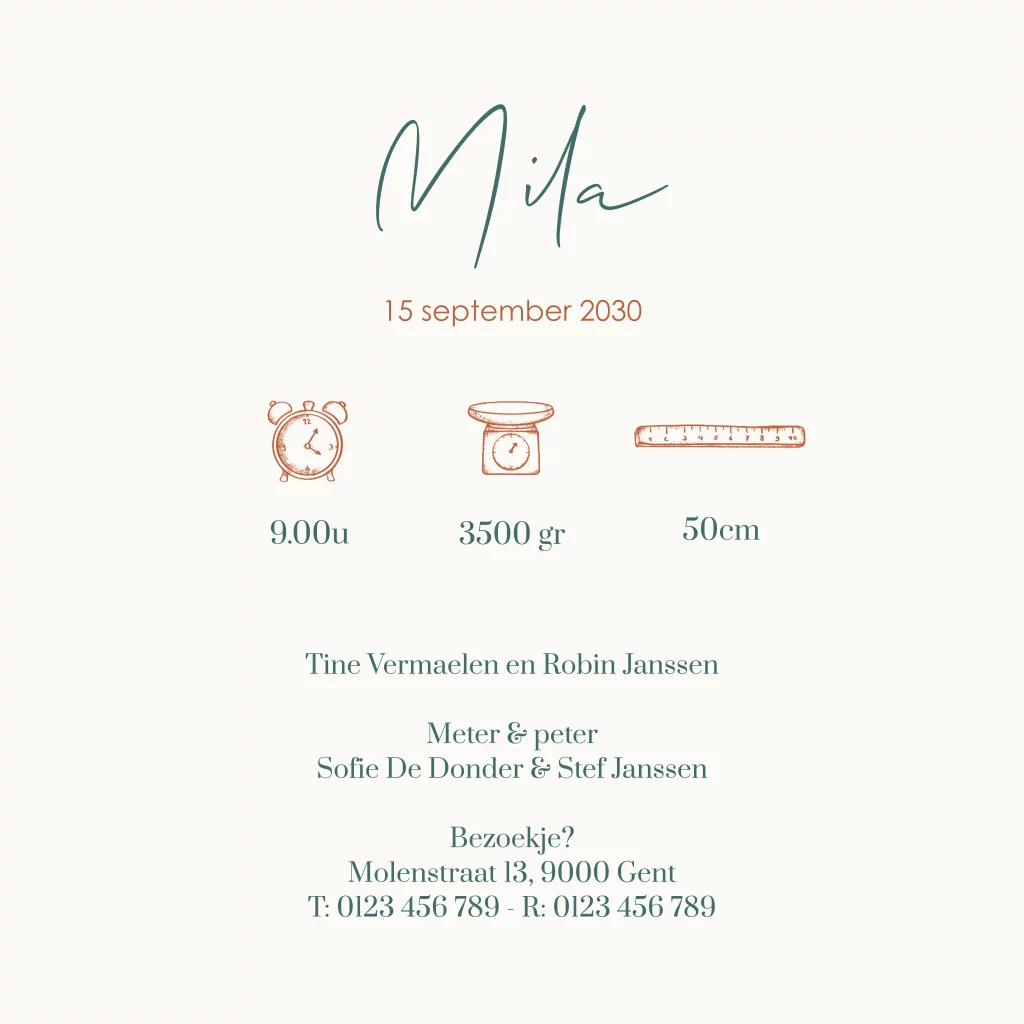 Een schattig vierkant geboortekaartje met een illustratie van een roodbruin vosje, lief! Op dit vrolijke geboortekaartje voor een meisje of een jongen is een trendy lettertype gebruikt. Aan de binnenzijde staan leuke icoontjes bij de tekst.