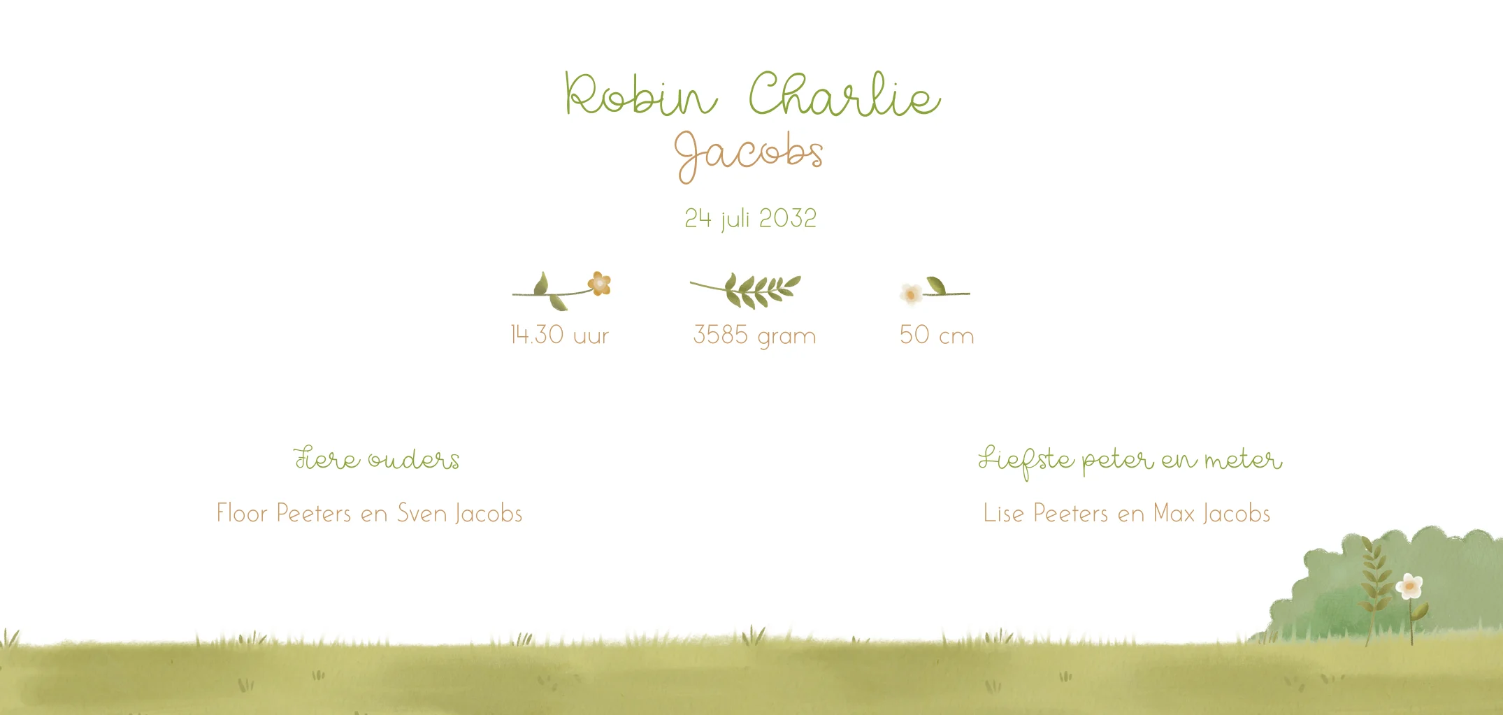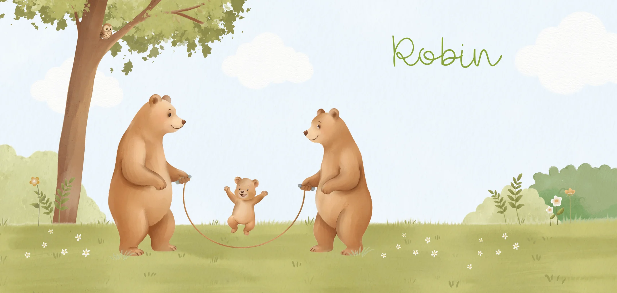 Lief geboortekaartje met een berengezin dat in het gras aan het springtouwen is. Zo vrolijk! Pas eenvoudig tekst en kleur aan in de online editor.