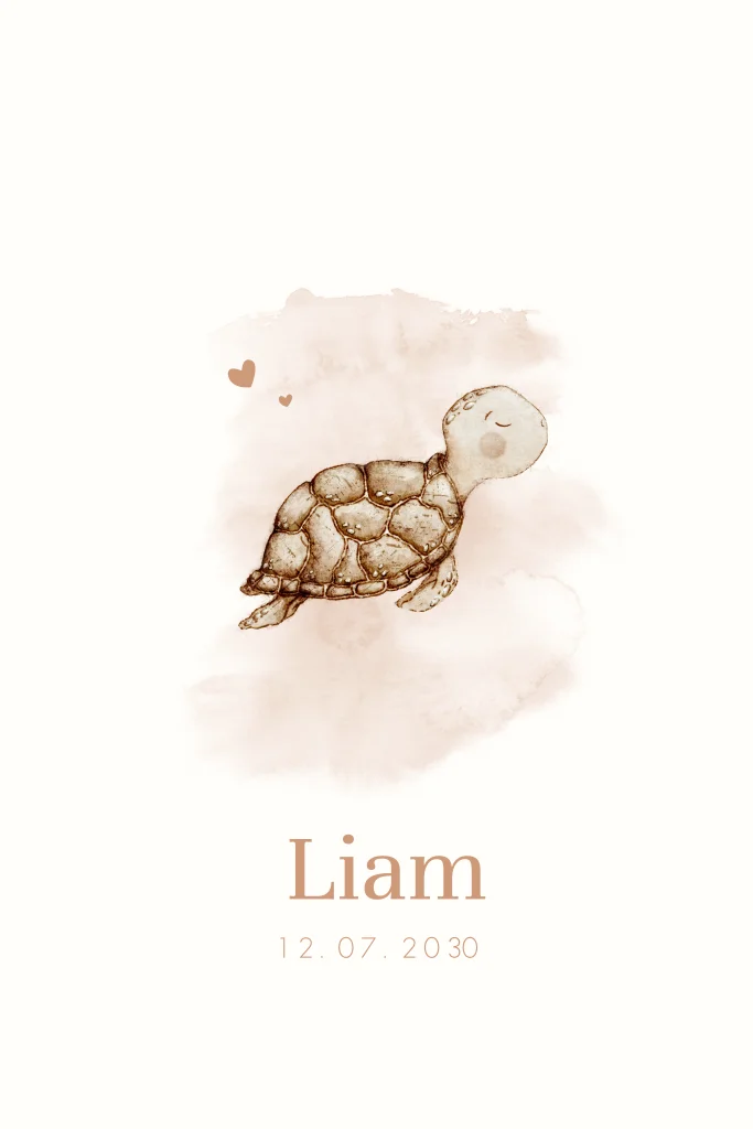 Schattig minimalistisch geboortekaartje met aquacolour schildpad. Pas het kaartje naar wens aan in de online editor.