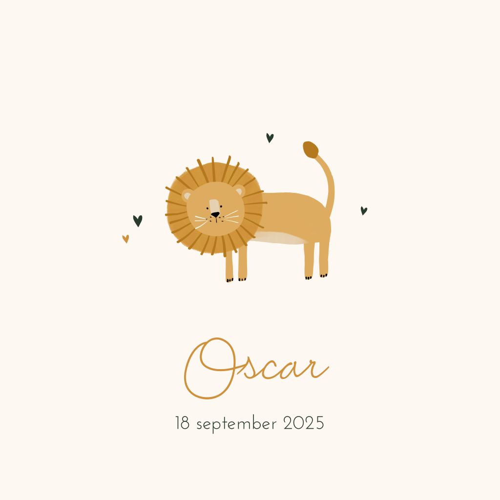 Wat een stoere geboortekaart met de illustratie van een leeuw! Door de hartjes krijgt deze kaart een lieve uitstraling. Pas de tekst gemakkelijk aan in de editor.