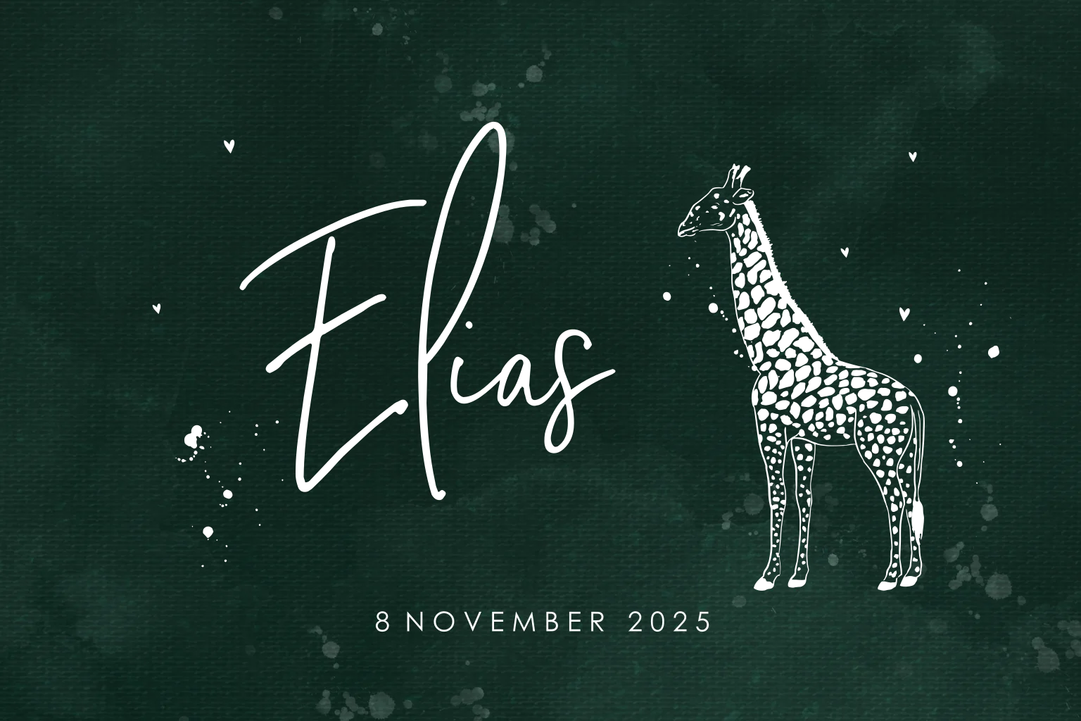 Stoer babykaartje met een groene achtergrond en goudfolie details. Op de voorkant van het kaartje staat een giraffe en de naam van jullie kindje in sierlijke letters.Bekijk ook ons babyborrelkaartje.