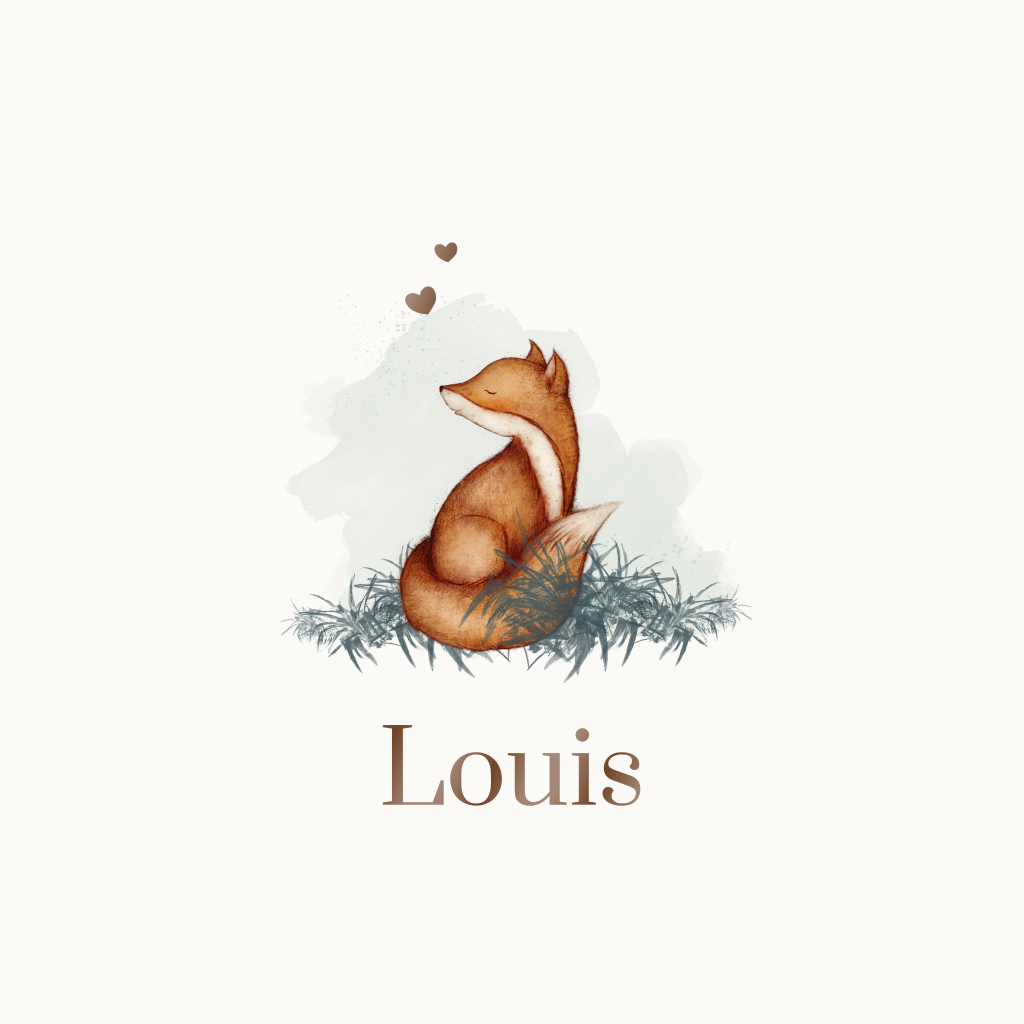 Een schattig vierkant geboortekaartje met een lief vosje dat zit tussen het groene gras. Op dit vrolijke geboortekaartje voor een meisje of een jongen is een trendy lettertype gebruikt met hoogglans. U kan dit aanpassen naar bijvoorbeeld goudfolie in de online editor. Aan de binnenzijde van dit kaartje komt het design weer terug maar dan in een liggend vosje.