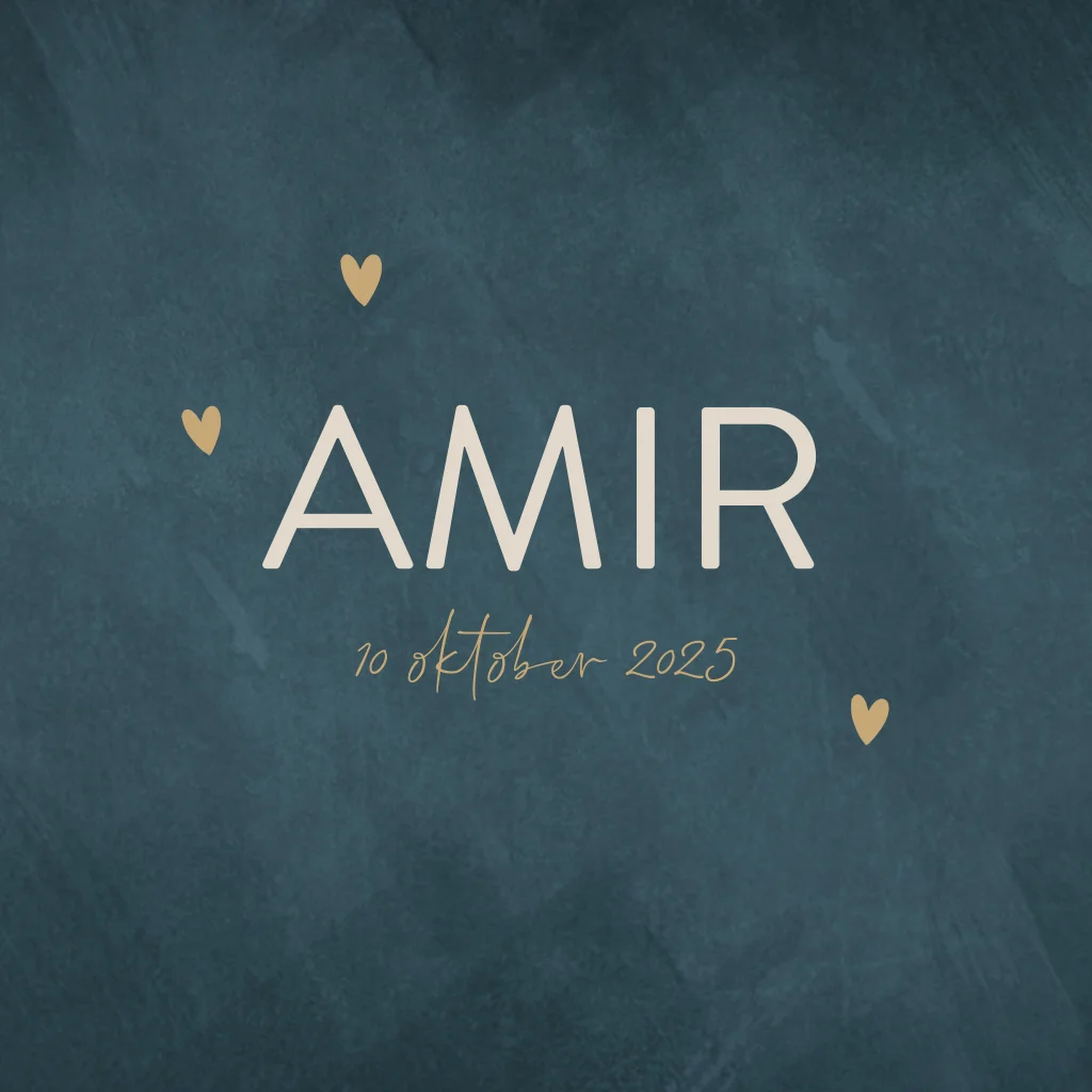 Een stoer geboortekaartje voor jullie kindje met een donkerblauwe waterverf achtergrond. De naam staat in trendy letters centraal, de lieve goudkleurige hartjes zorgen voor een lief accent. Voeg eigen tekst toe in de online editor op dit hippe kaartje.