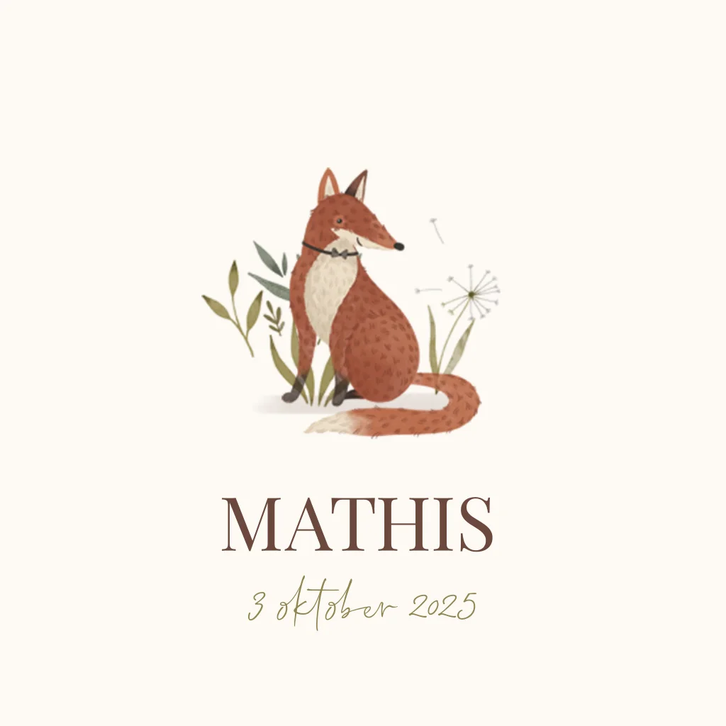 Superleuk, dit geboortekaartje met een schattig vosje! Iets voor jullie kleine? In het midden zit het vosje tussen de takjes, de naam staat in modern lettertype onder de tekening. Deze pas je eenvoudig zelf aan in de online editor, net als de tekst op de achterzijde.