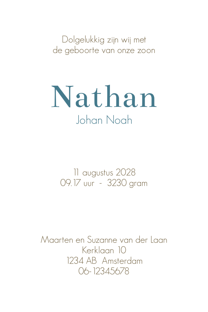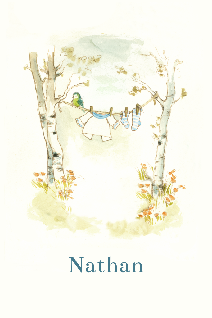 Hou je van romantische plaatjes, dan is dit geboortekaartje echt iets voor jullie zoontje! Tussen twee bomen hangt een waslijn met jongenskleertjes, ernaast zit een lief vogeltje. De tekst is in bijpassende kleuren en kan eenvoudig naar wens worden aangepast in de online editor.