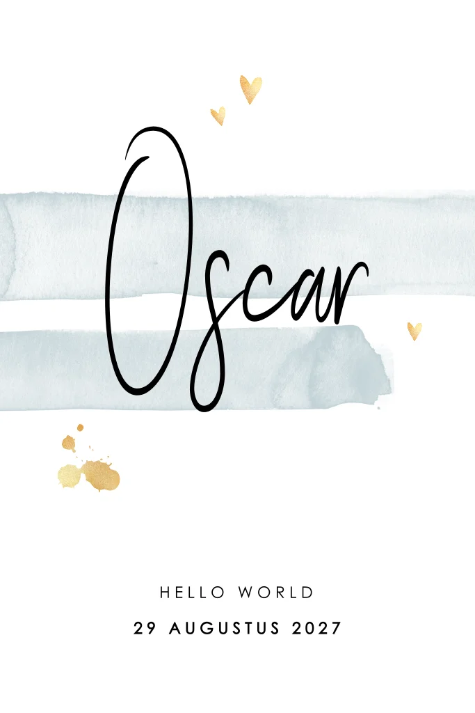 Hip geboortekaartje met een aquarelstreep in blauw met daarop de naam in sierlijke typografie. Pas de tekst naar wens aan in onze online editor.