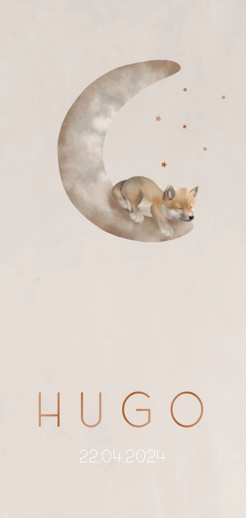 Lief geboortekaartje met zachte kleuren. Op de langwerpige kaart staat een wolfje die slaapt op de maan. De subtiele sterretjes maken het geheel af. Prachtig te combineren met bijbehorende producten.