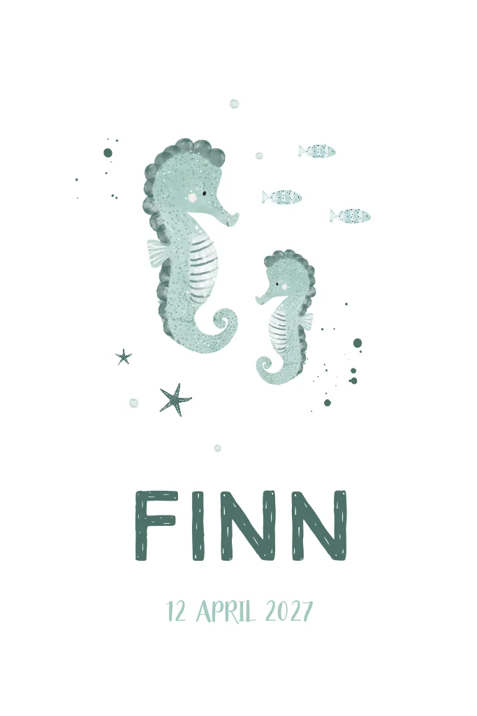 Lief geboortekaartje voor een jongen in zee-thema. Op de voorkant staan een moeder en kind zeepaardje in lichtblauwe aquarel met visjes er omheen. Het zeepaardje komt ook terug op de achterkant van het kaartje.