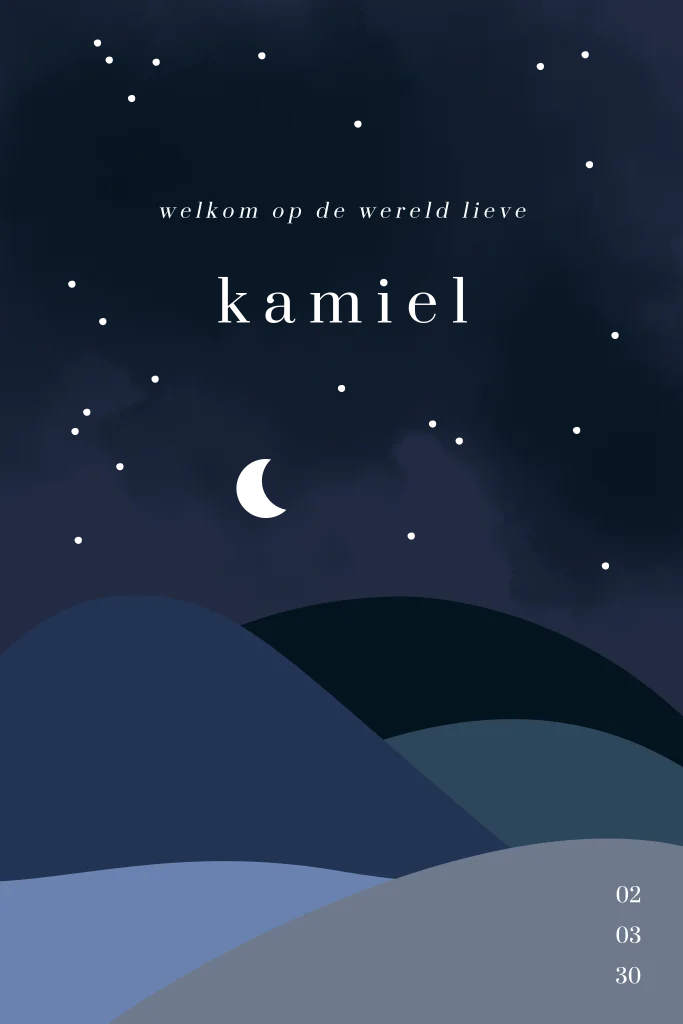 Geboortekaartje met bergen, de maan en sterren