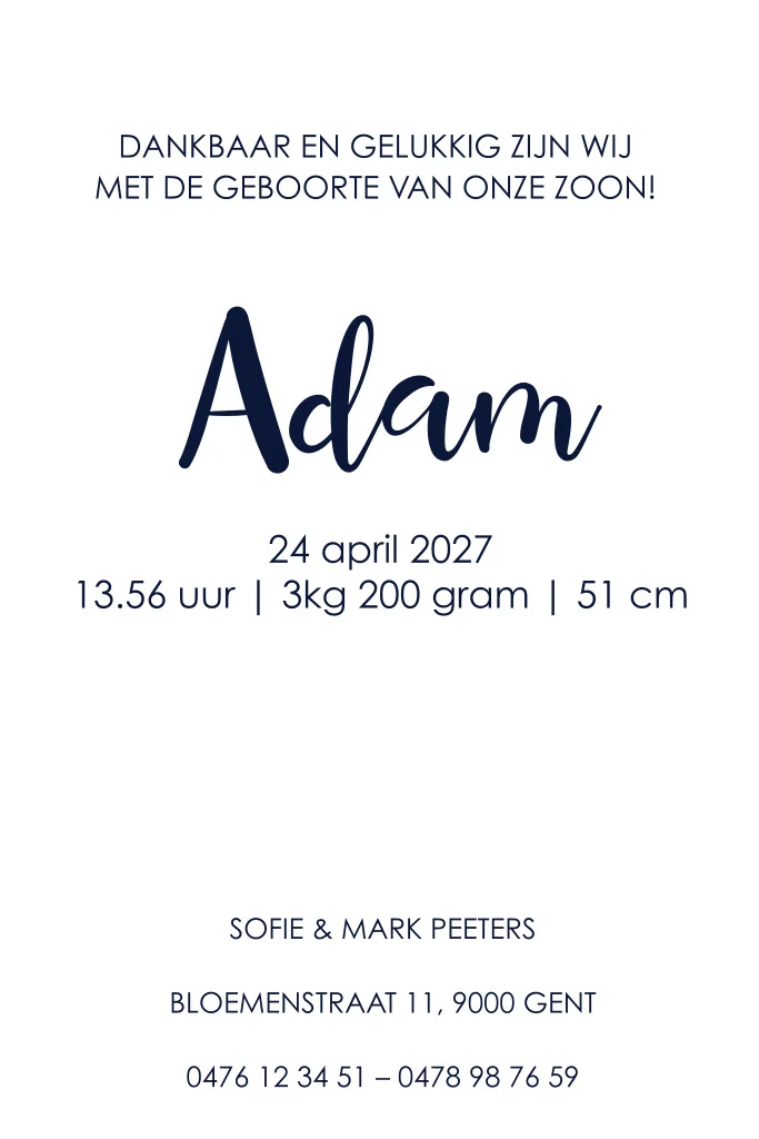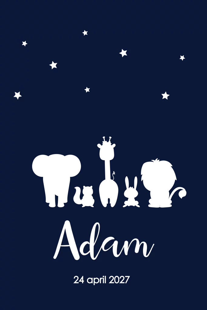 Trendy geboortekaartje voor de geboorte van jullie zoontje. Op de diepblauwe achtergrond staan de silhouetten van jungle-dieren in goudfolie onder de sterrenhemel. De naam van de kleine staat in een hip lettertype. Liever een ander lettertype of kleur? In de online pas je het kaartje helemaal naar eigen smaak aan, zo gedaan!