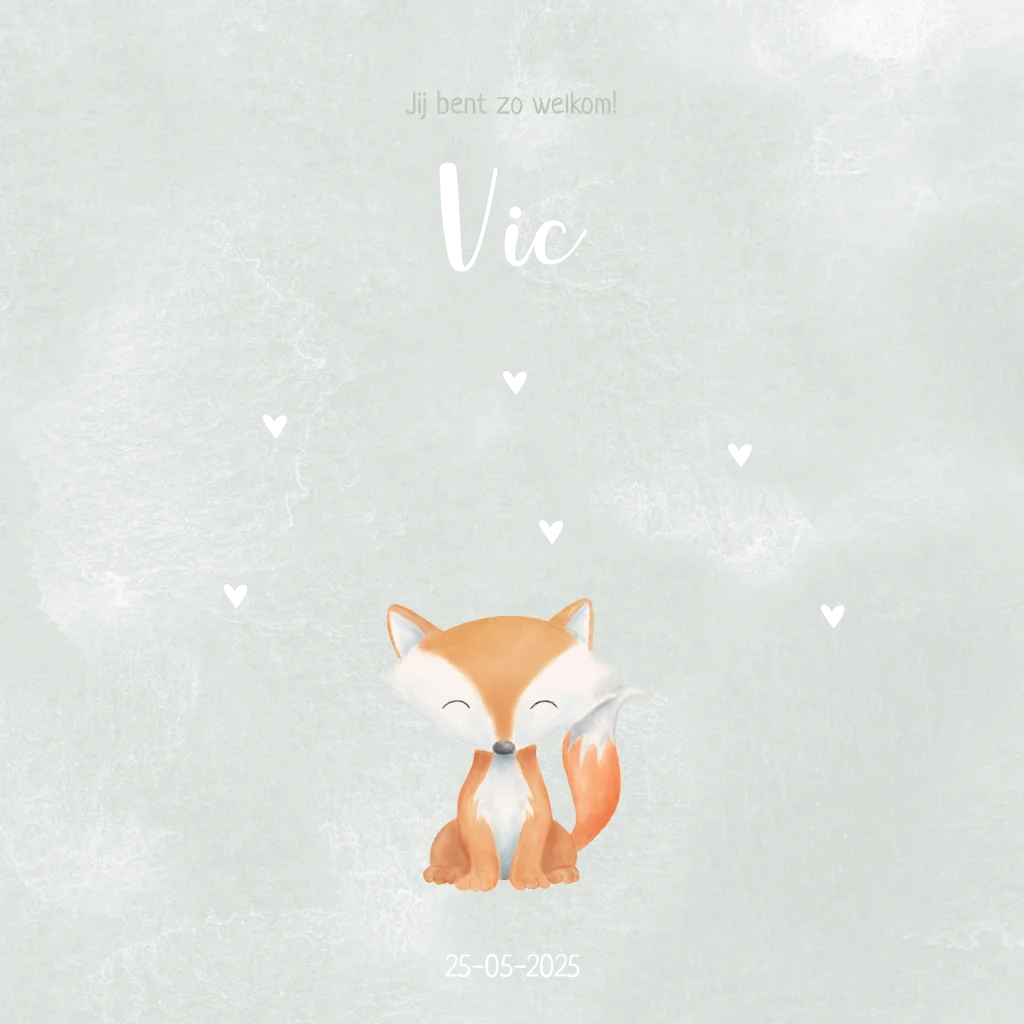 Lief babykaartje voor een jongen met de illustratie van een vosje op een mooie grijze waterverf achtergrond! De naam en de hartjes worden in goudfolie gedrukt, waardoor het kaartje een luxe uitstraling krijgt.
