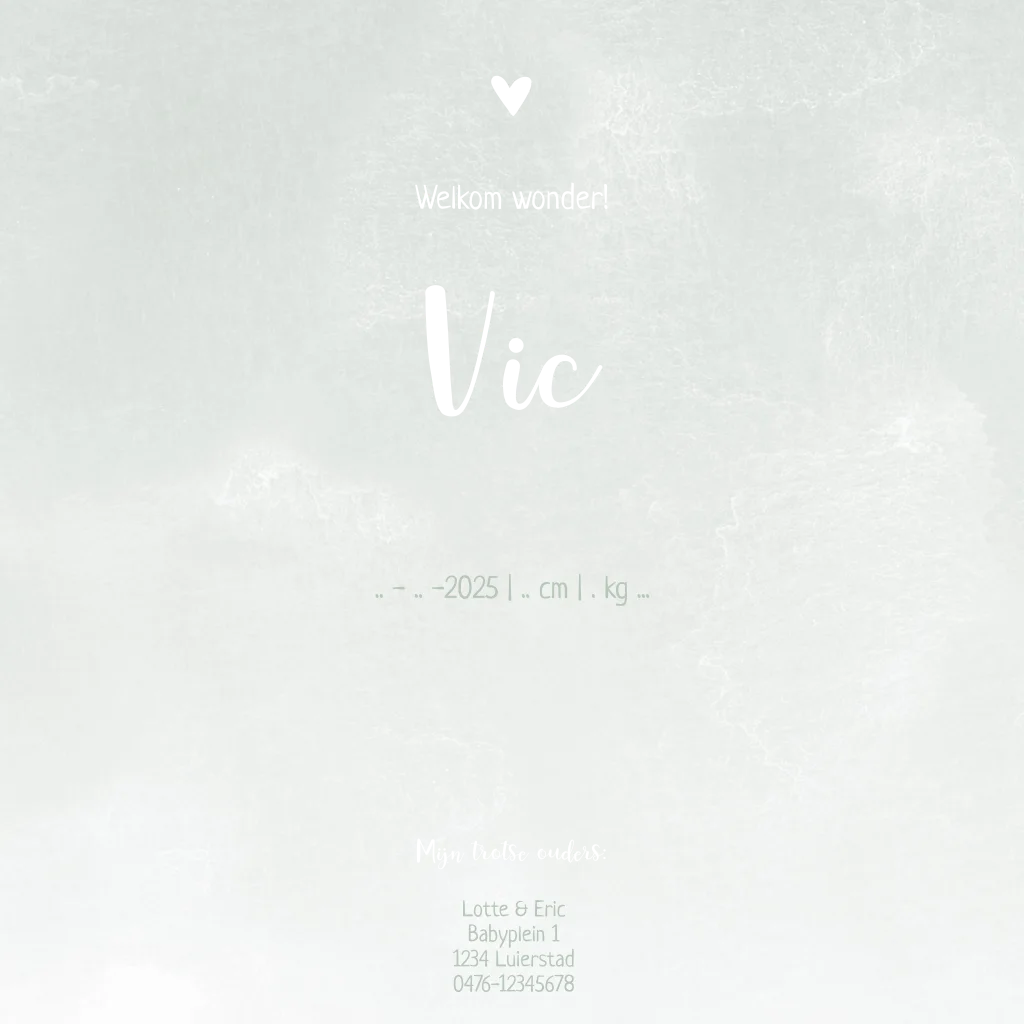 Lief babykaartje voor een jongen met de illustratie van een vosje op een mooie grijze waterverf achtergrond! De naam en de hartjes worden in goudfolie gedrukt, waardoor het kaartje een luxe uitstraling krijgt.Totaalprijs: 0 |